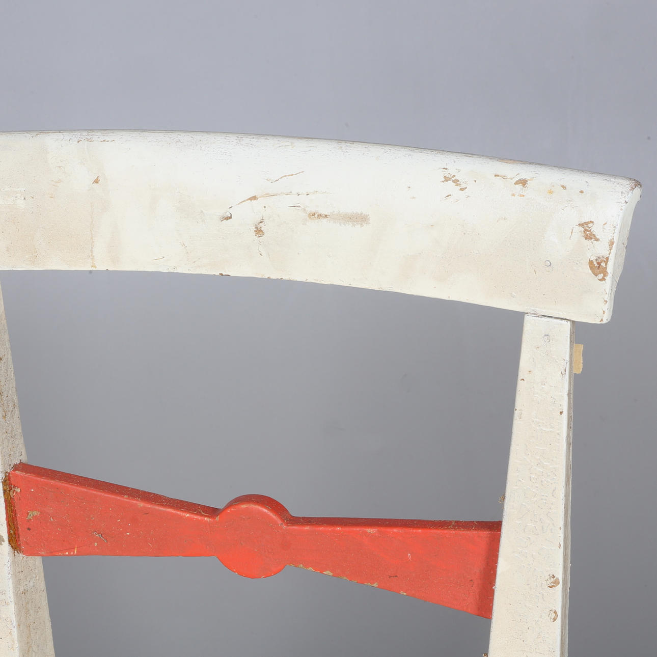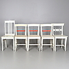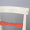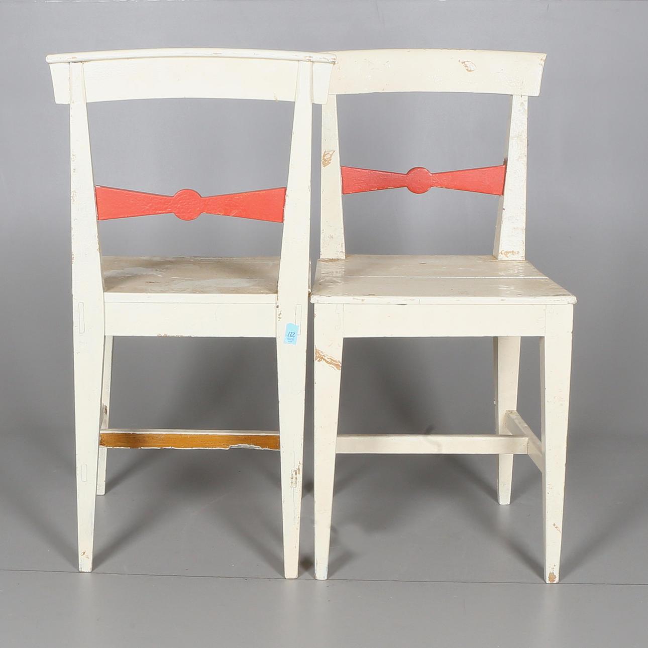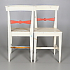 Tre snarlika med senare bemålning i vitt/rött, sitthöjd 46 cm. En jugendstol, så kallad äpplestol, sitthöjd 45,5 cm. Stol, sitthöjd 45,5 cm.
