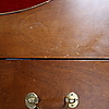 Med tre draglådor. Bärhandtag i mässing samt med mässingsdetaljer. På fyra hjultrissor.