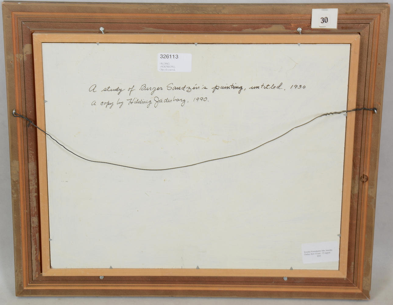 A copy by Hilding Jaderborg, 1990. Utställd på Svenska konstskatter från Amerika. Örebro slott 15-juni till 19 augusti. 2001. 41x51 cm. Signerad A tergo.
