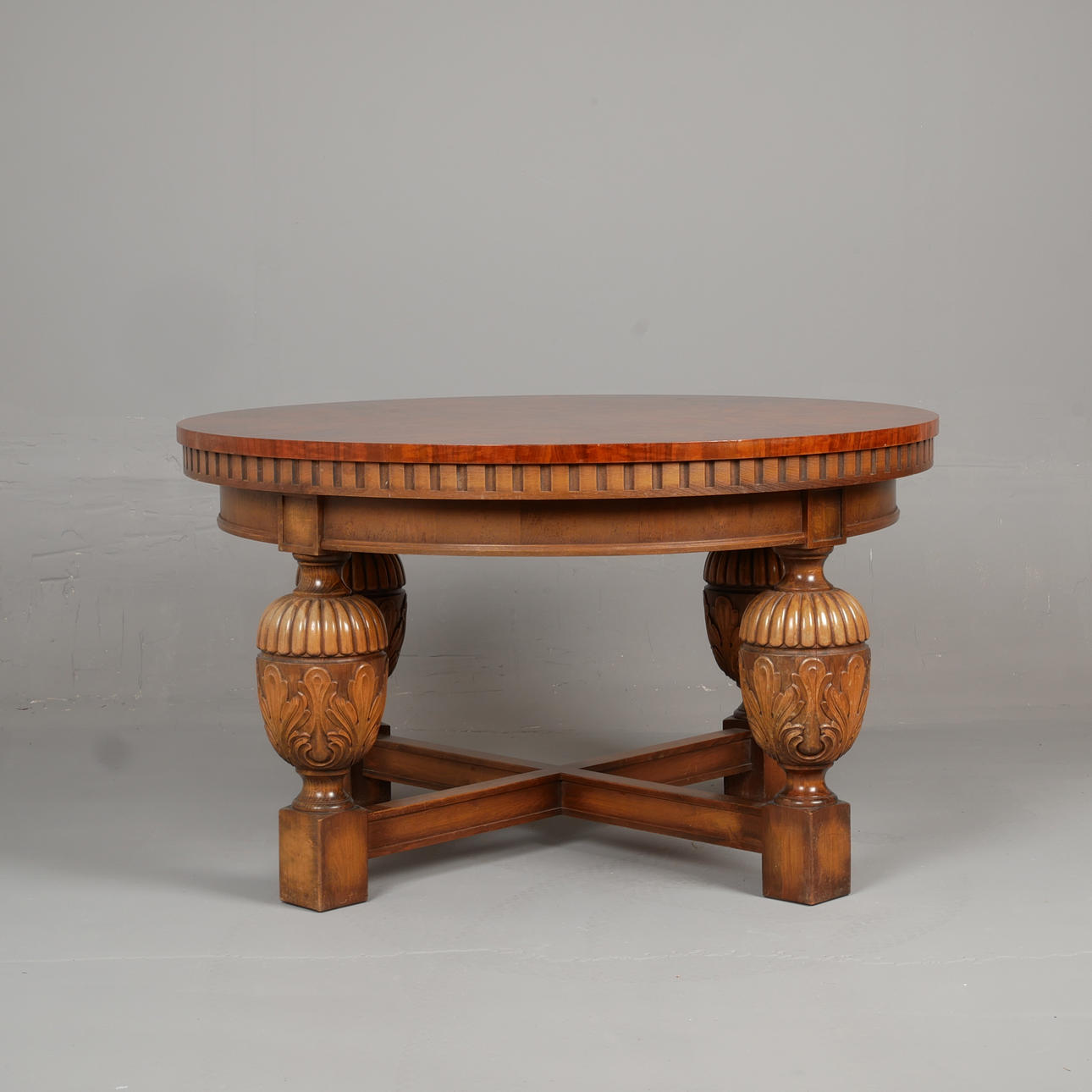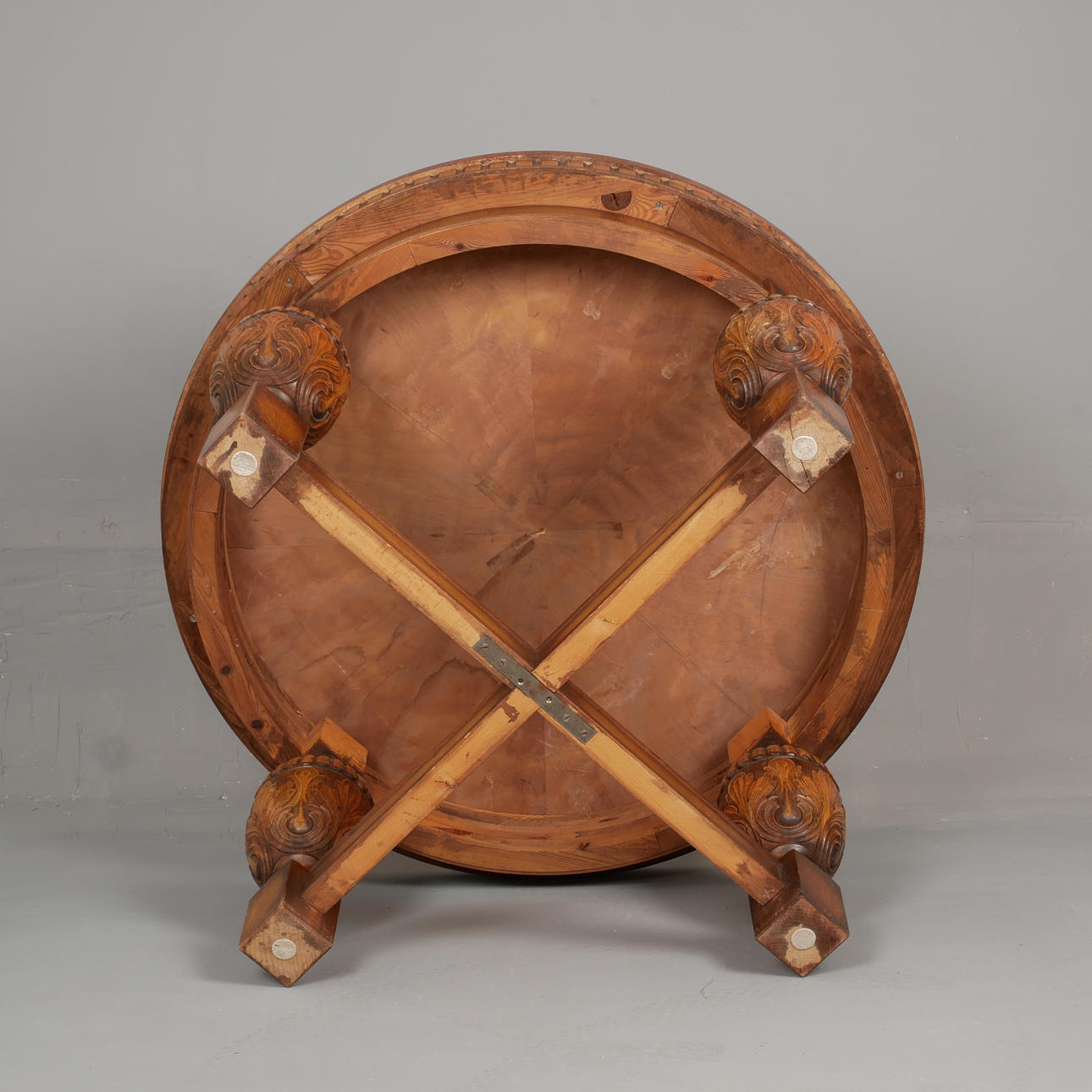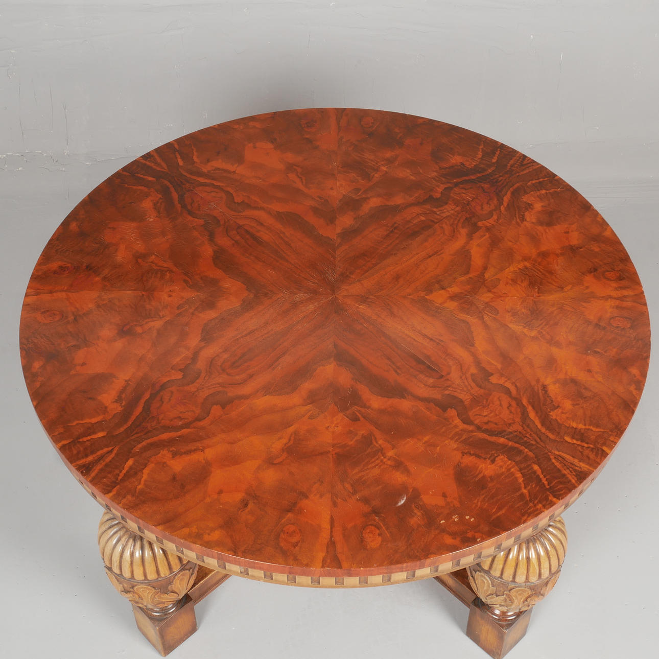 Valnötsfanerad skiva. Underrede i mörkbetsad bok. Kopplade ben. Diameter 100 cm, höjd 59 cm.