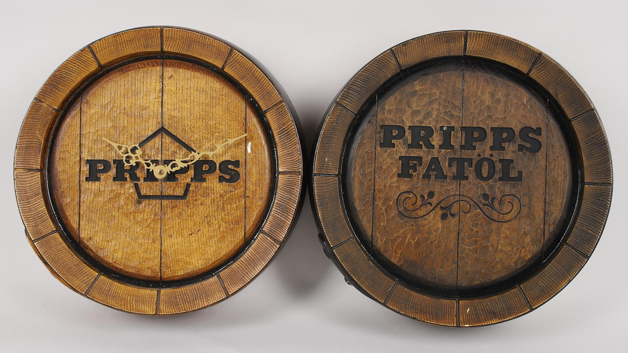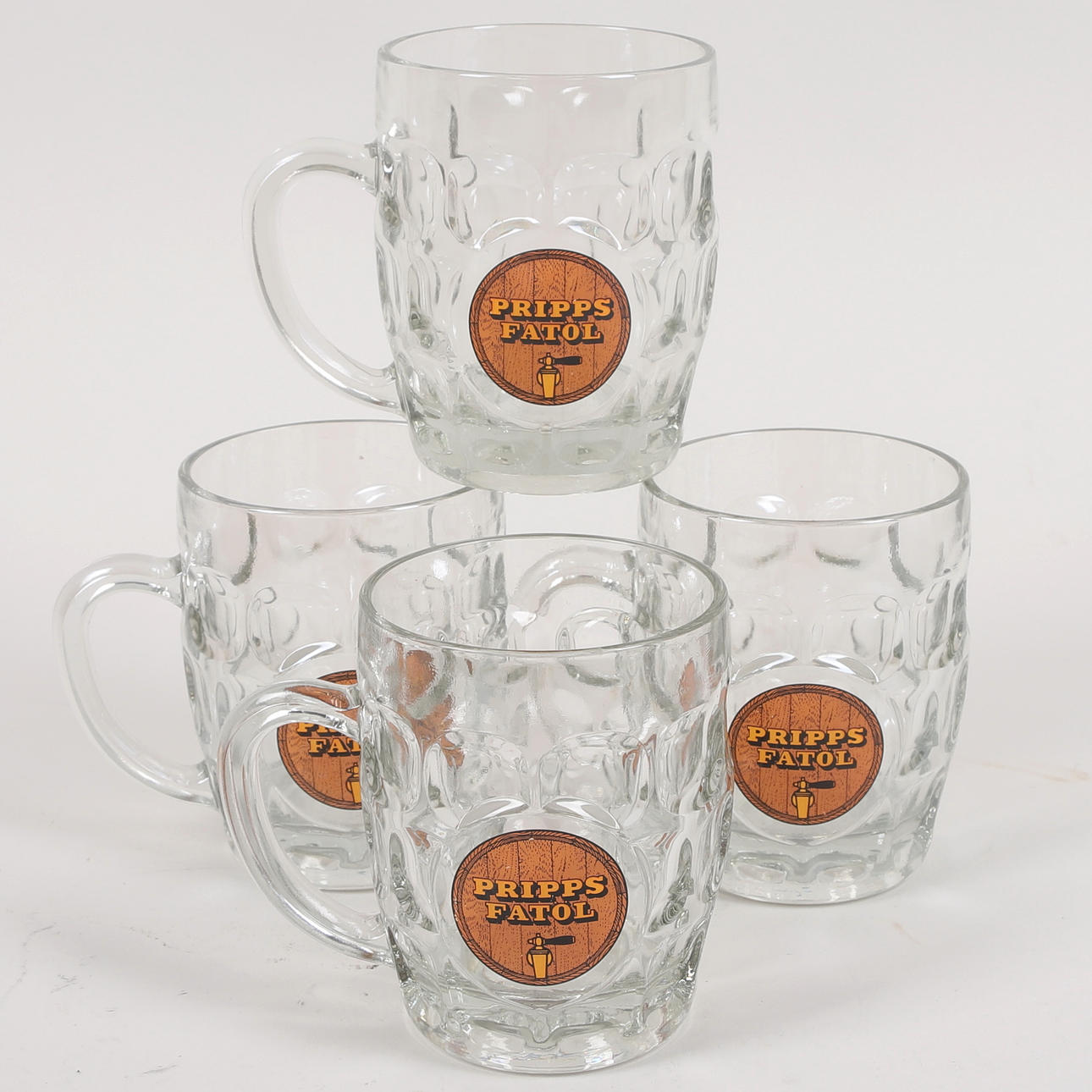 Väggklocka & reklamskylt, glasfiber, Finndeco, diameter ca 37 cm. 4 st ölglas, höjd ca 11 cm.