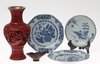 Bestående av vas i lackarbete, offerskål och 2+1 mindre fat. Vasens höjd 21 cm.