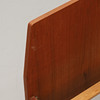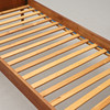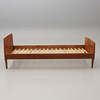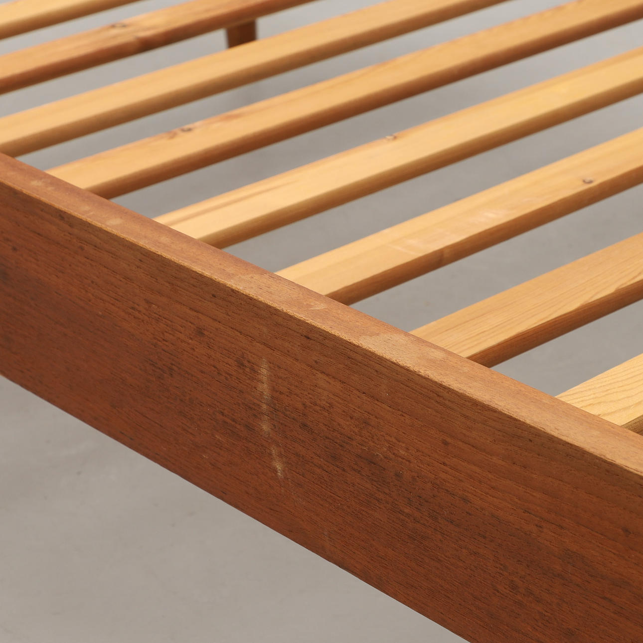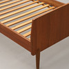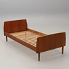 Teakfanerad med ben i bok. Ett par sänggavlar, ett par sidor, ribbotten. Gavlarnas bredd 90, höjd 56-67 cm. Sidornas längd 185 cm. För madrassmått 85 x 185 cm.