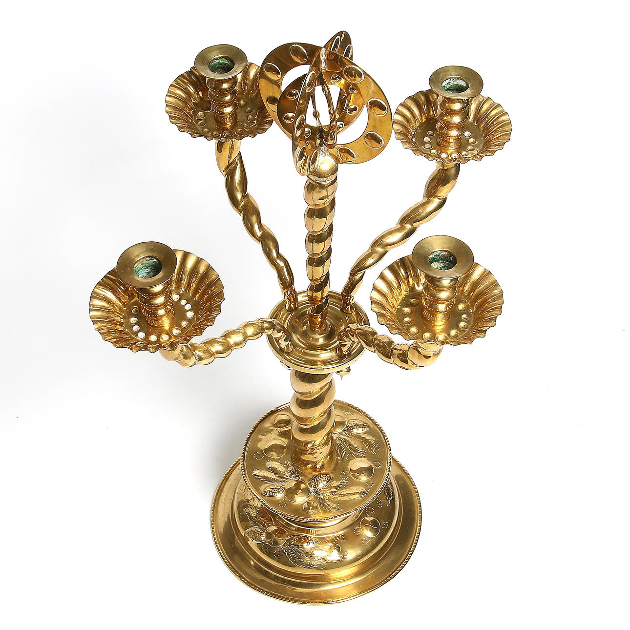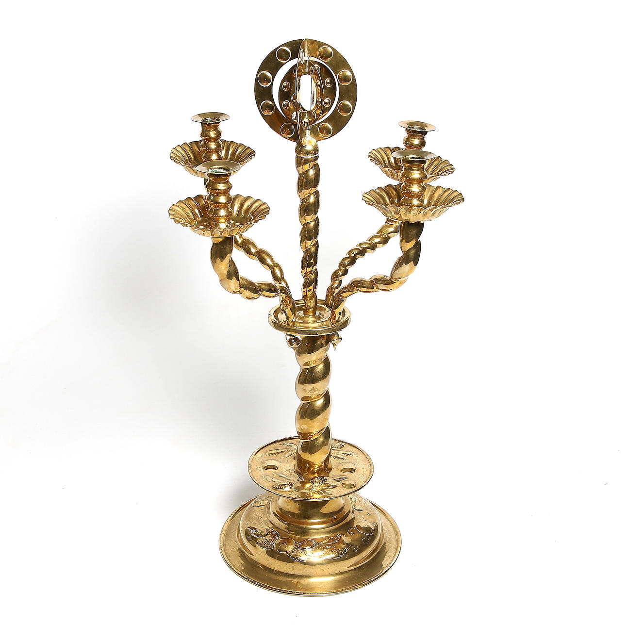 Fyra ljusarmar, punsad dekor, höjd 65 cm, diameter vid fot 24 cm.