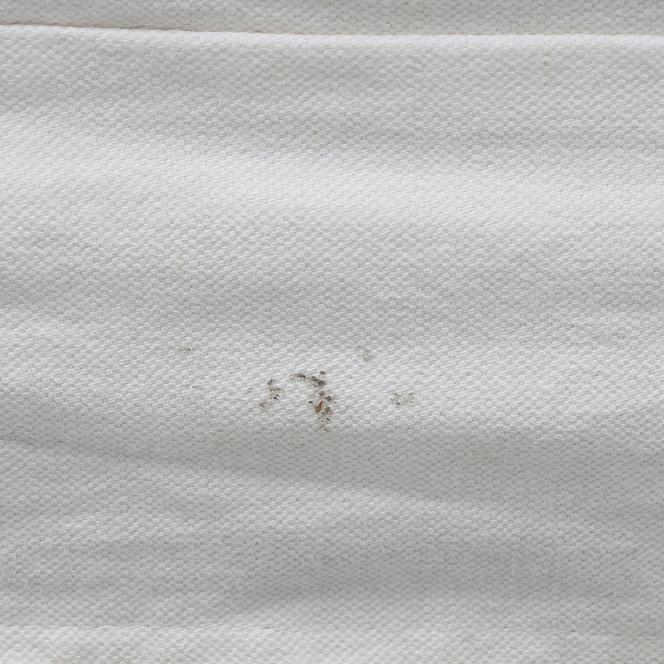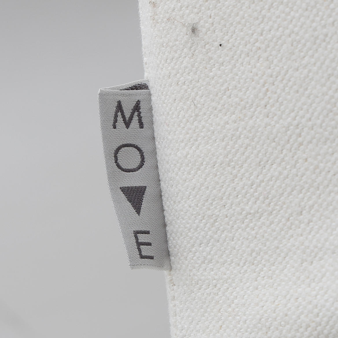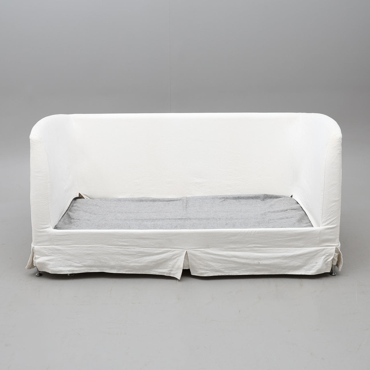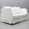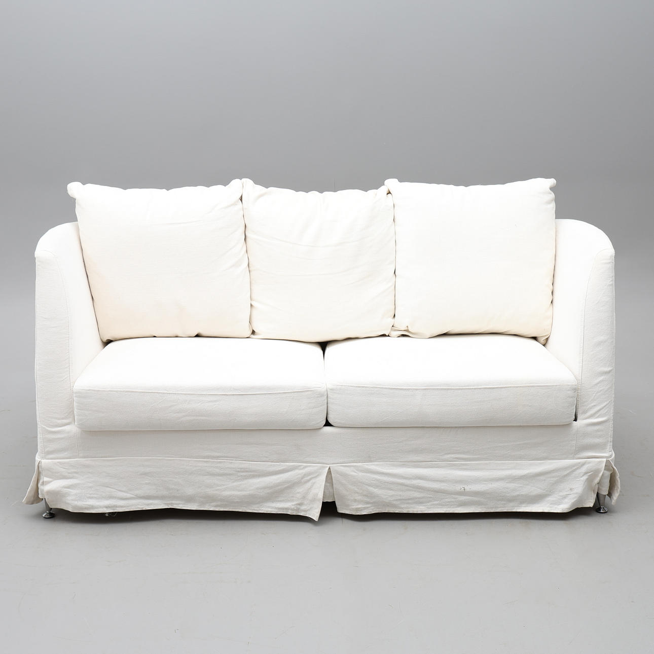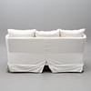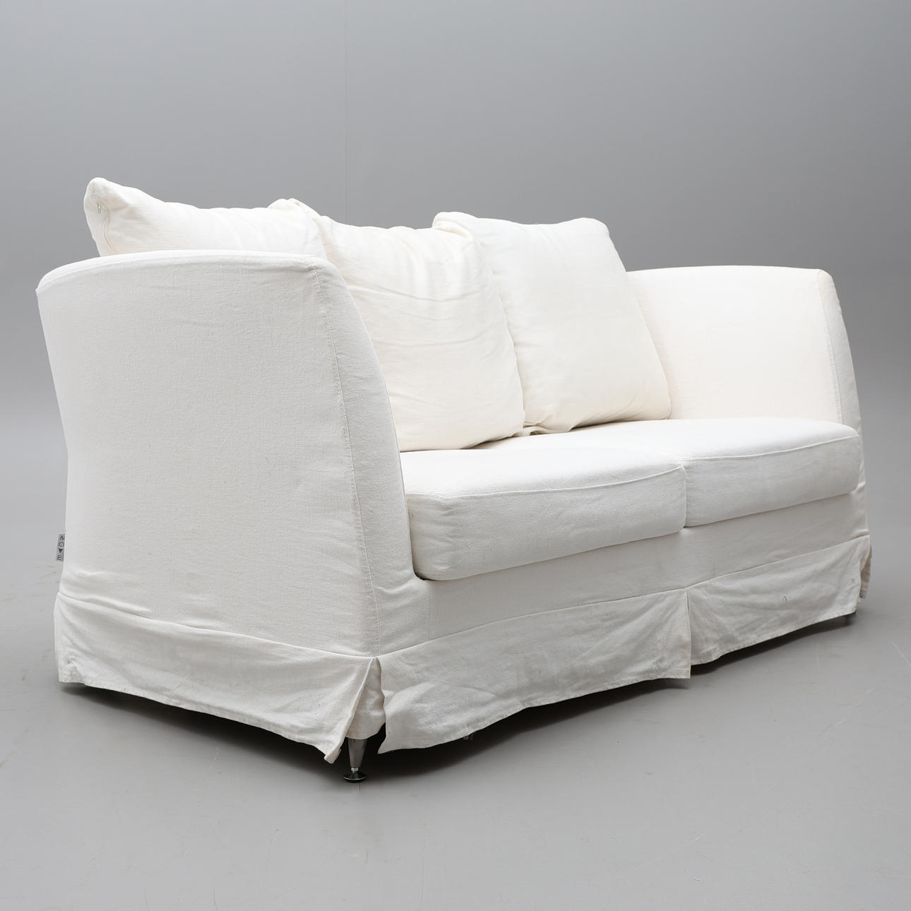 Två-sits med lösa sitt- och ryggplymåer, vit avtagbar textilklädsel, rygghöjd 70, längd ca 164 samt djup ca 75 cm. Senare hjul.