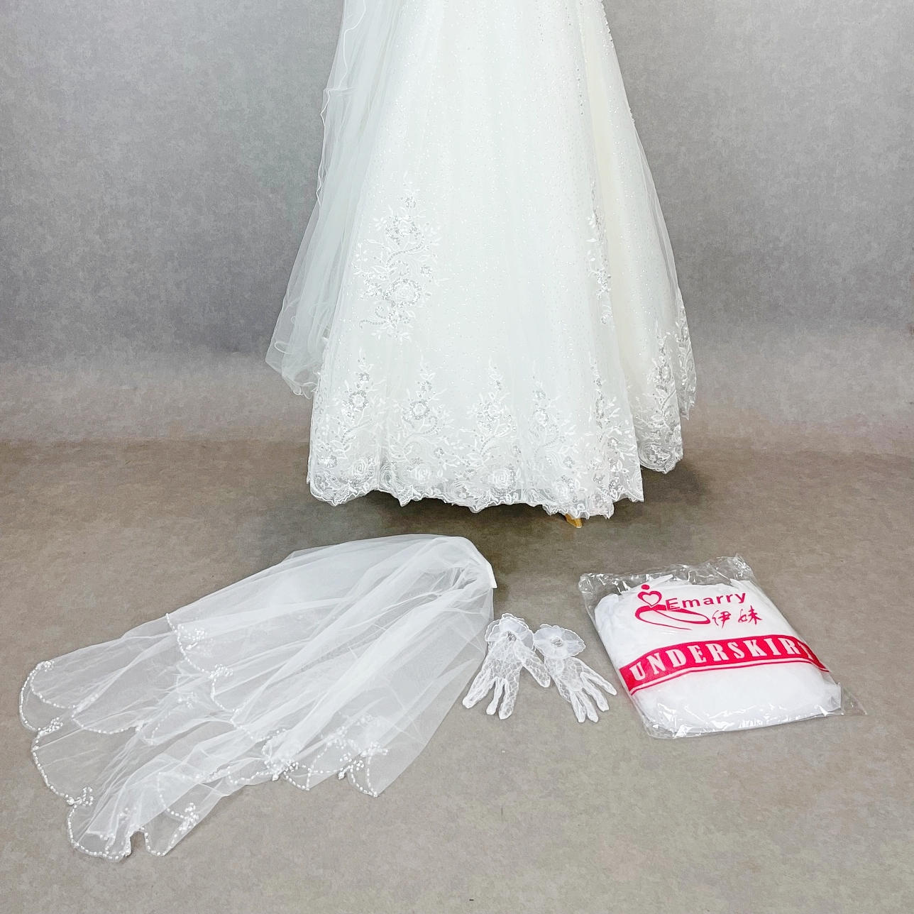 Handskar, extra underkjol och slöja medföljer.