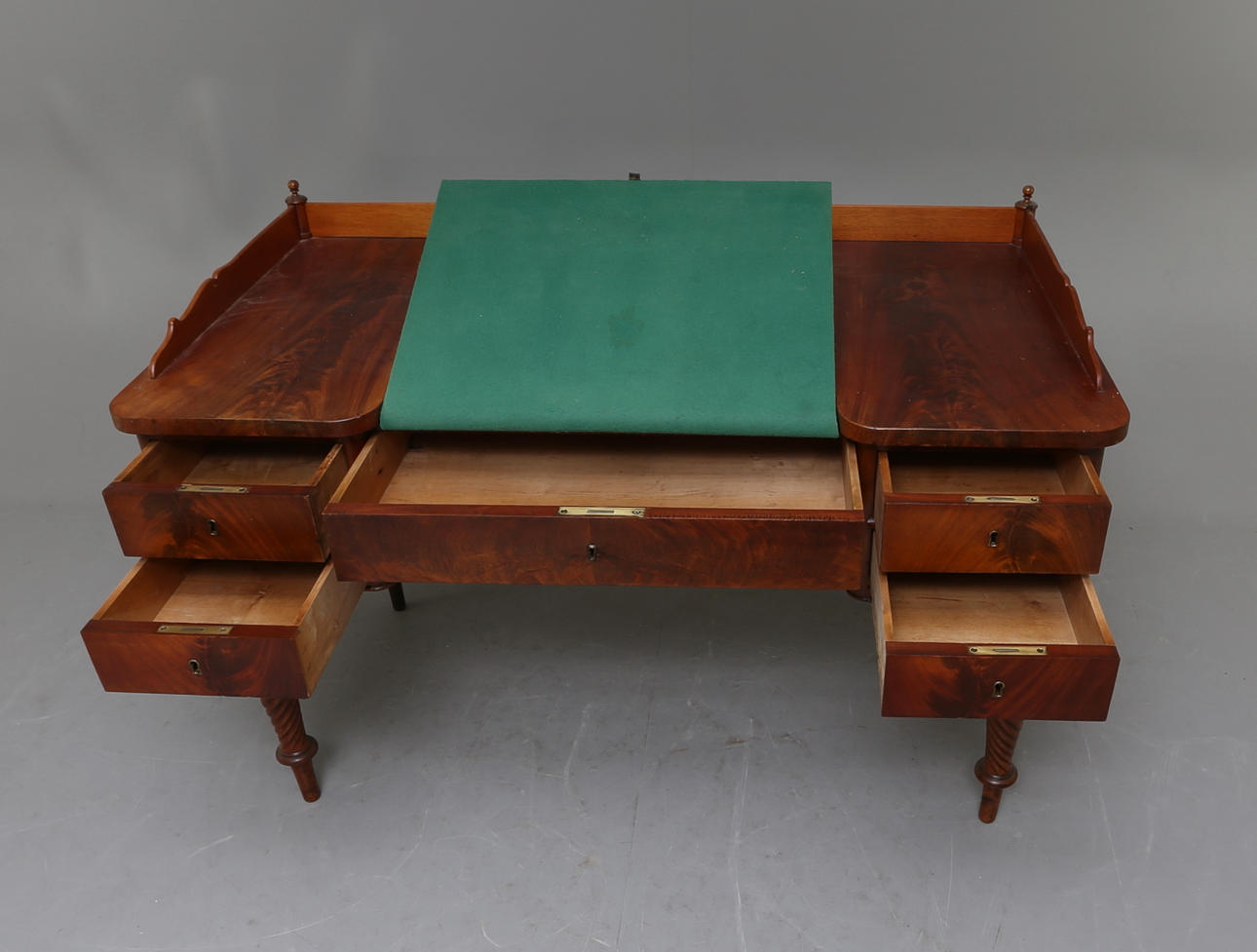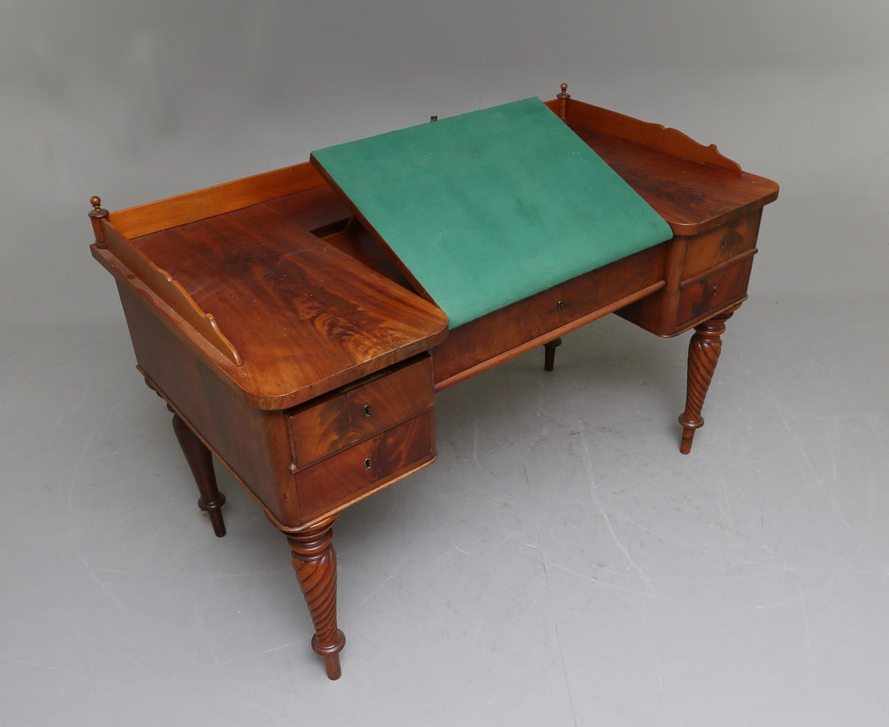 Fristående. Med uppfällbar mittdel av skrivbordsskivan, klädd i grön textil.