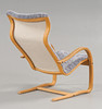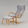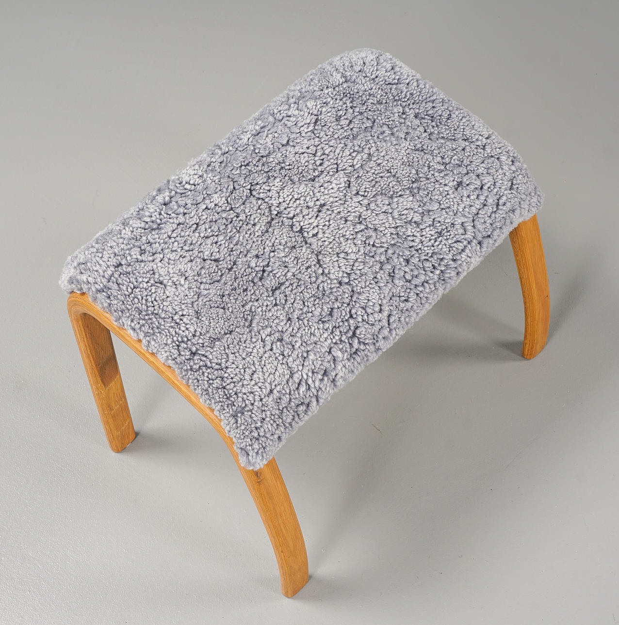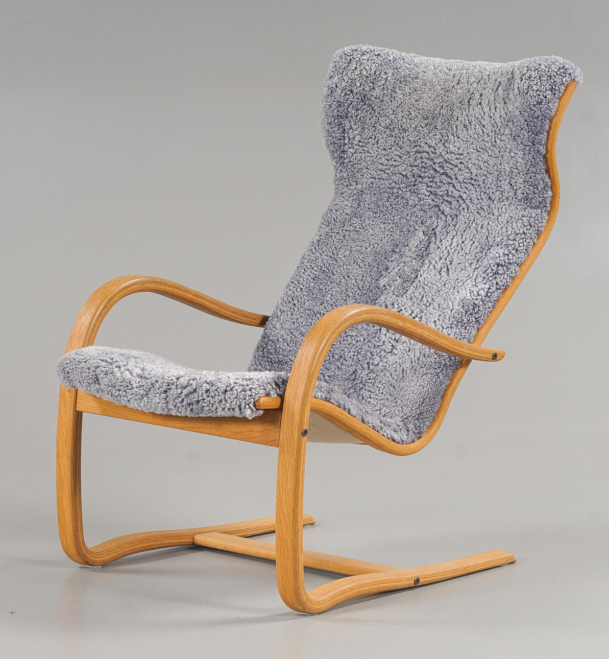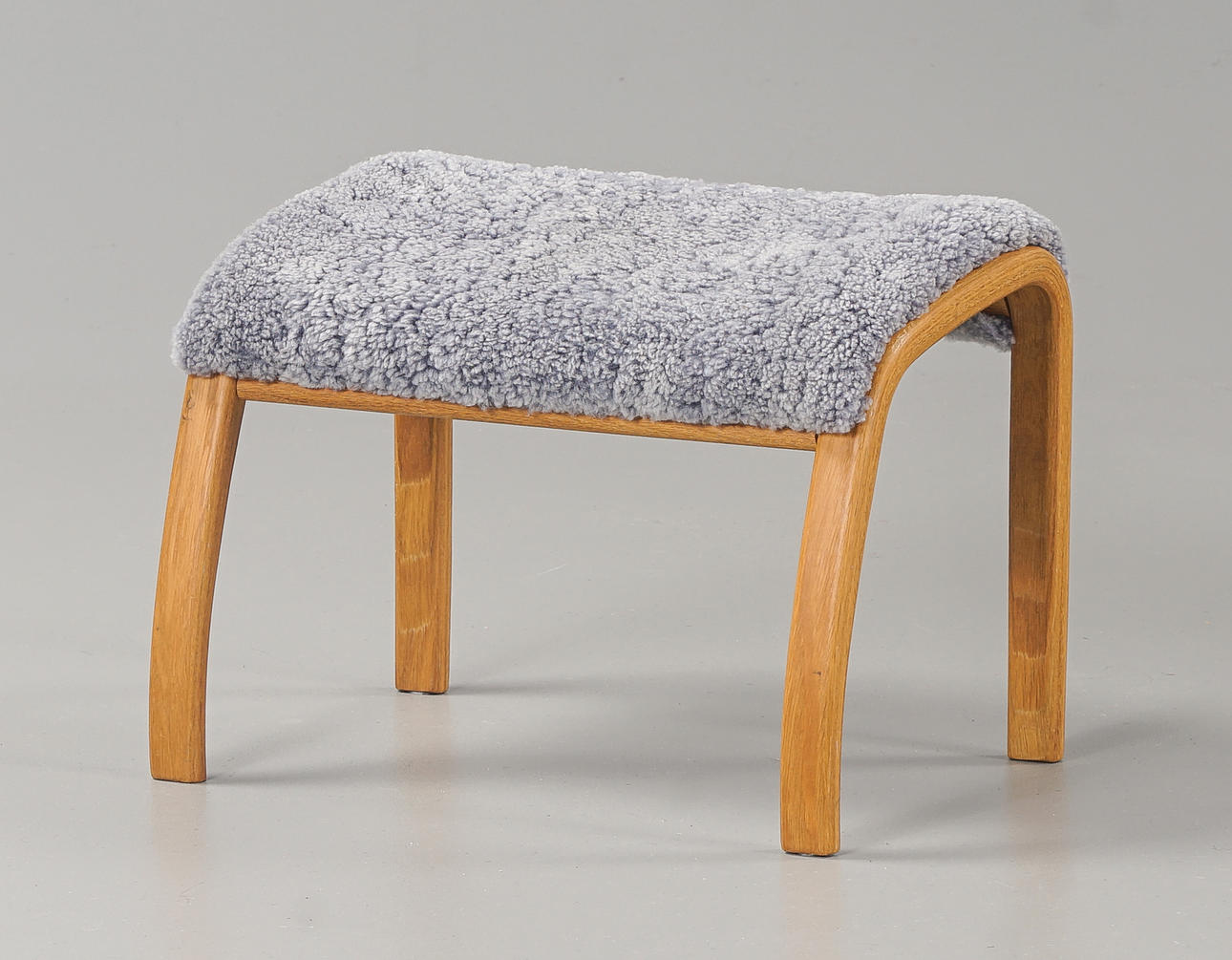 Med fotpall, stommar i ek, klädda med fårskinn.