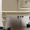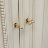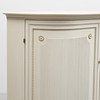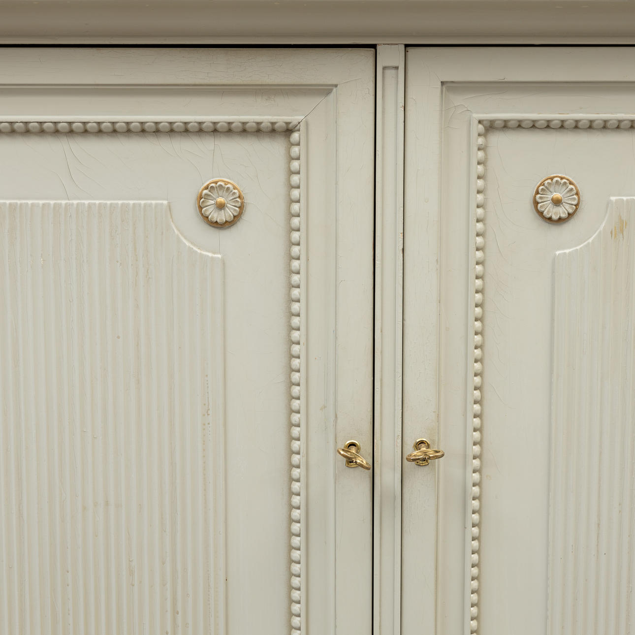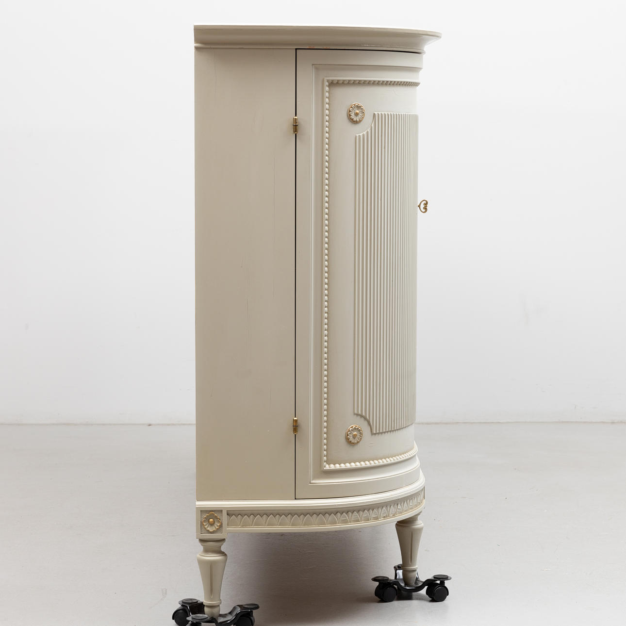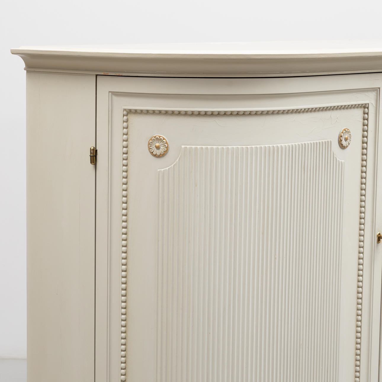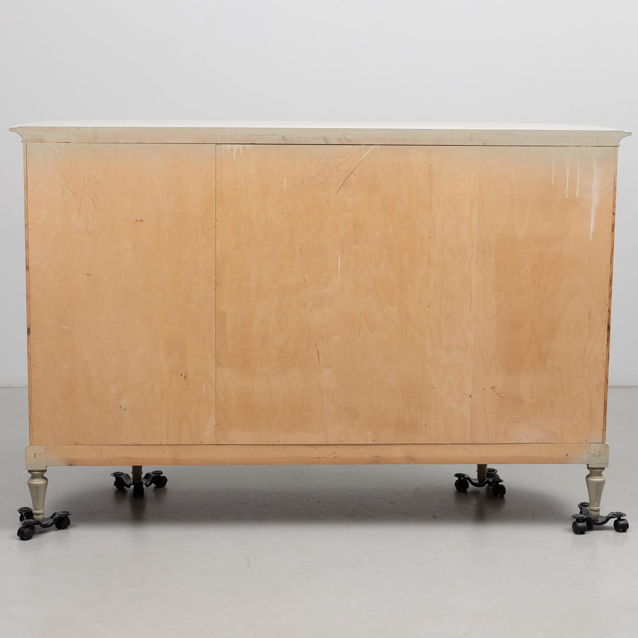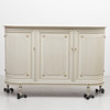Tre dörrar varav två svängda, insida med hyllor och lådor. Räfflade dörrar. Längd ca 167, djup 47,5, höjd ca 110 cm.