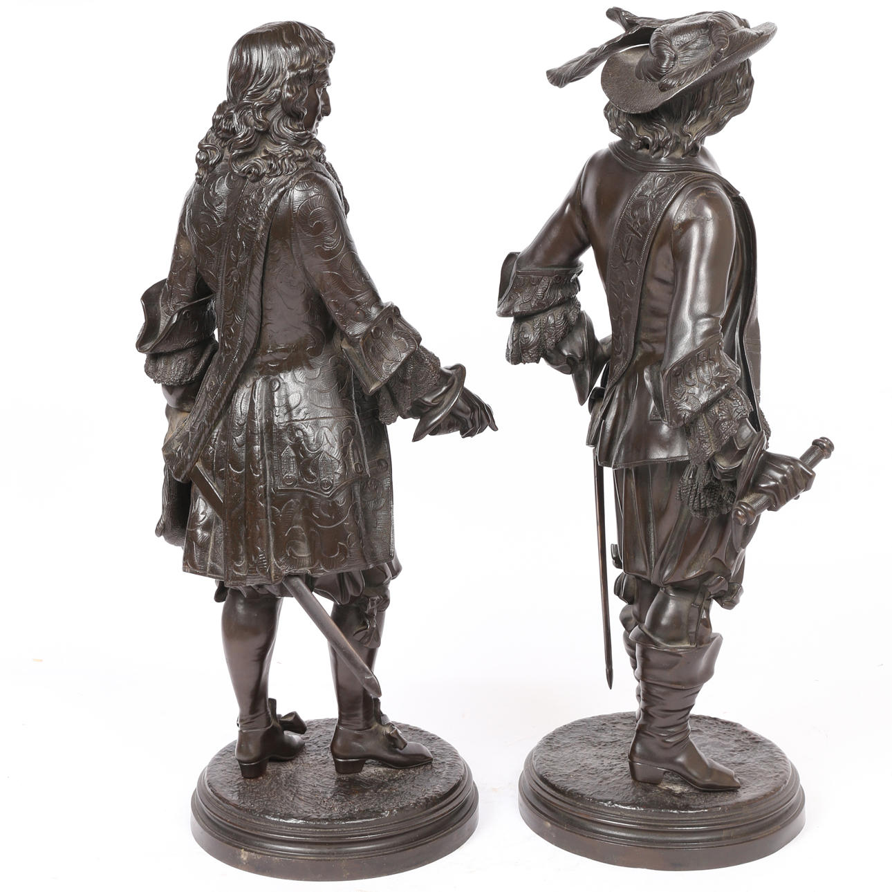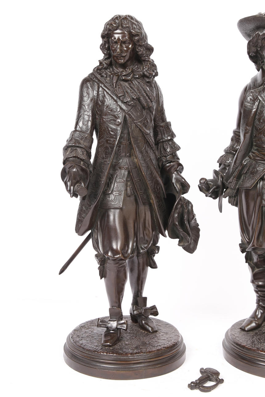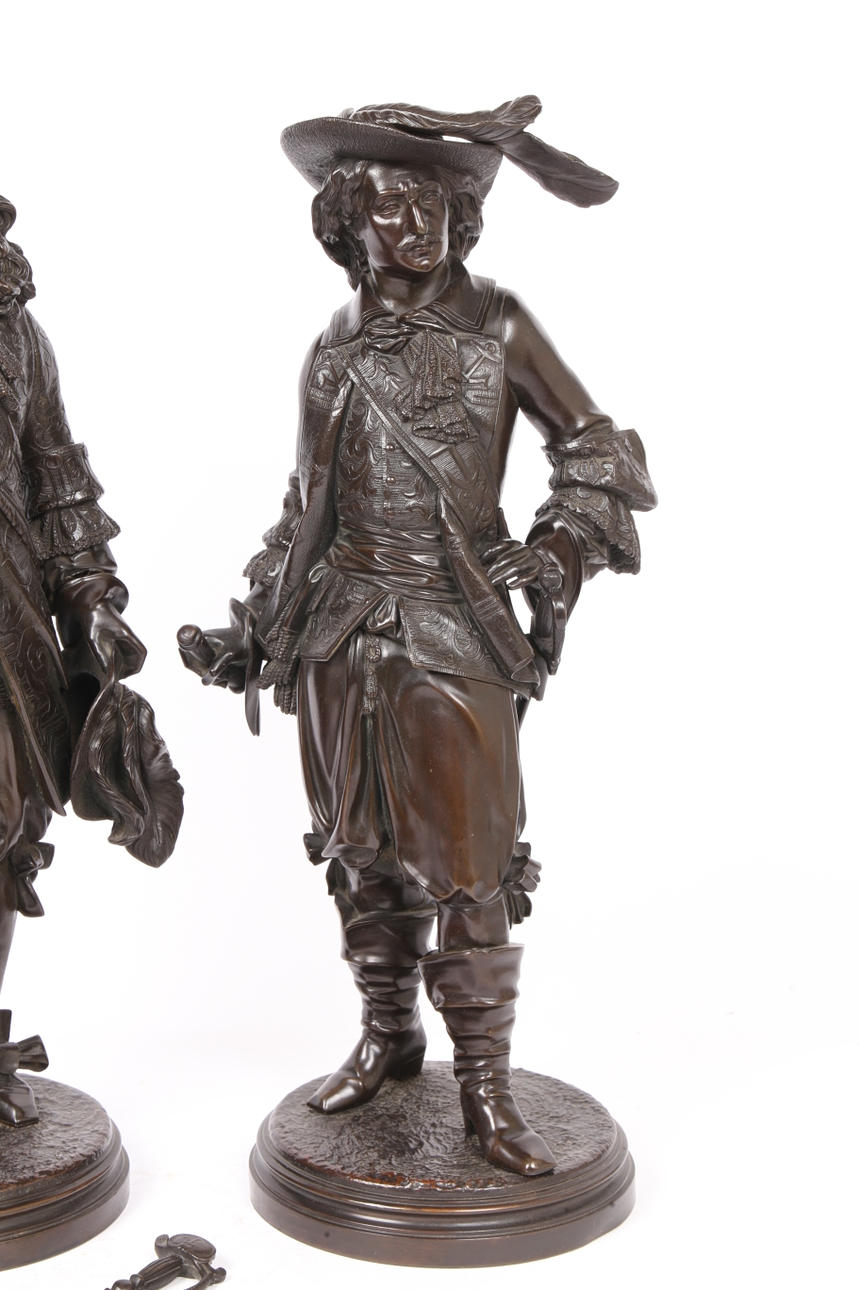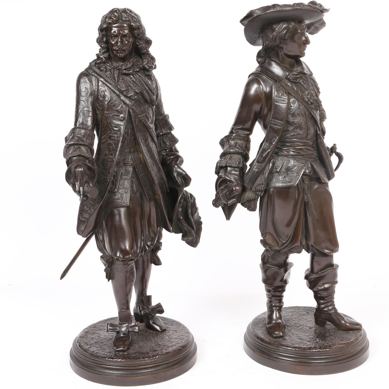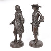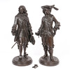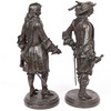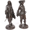 modellerad i stående positioner, den första bär en fjäderplymd hatt, hans högra hand håller en rulle, den andra håller sin fjäderluffade hatt till vänster och en rulle till höger, på naturalistiskt gjutna runda baser, 48 cm och 48,5 cm höga.