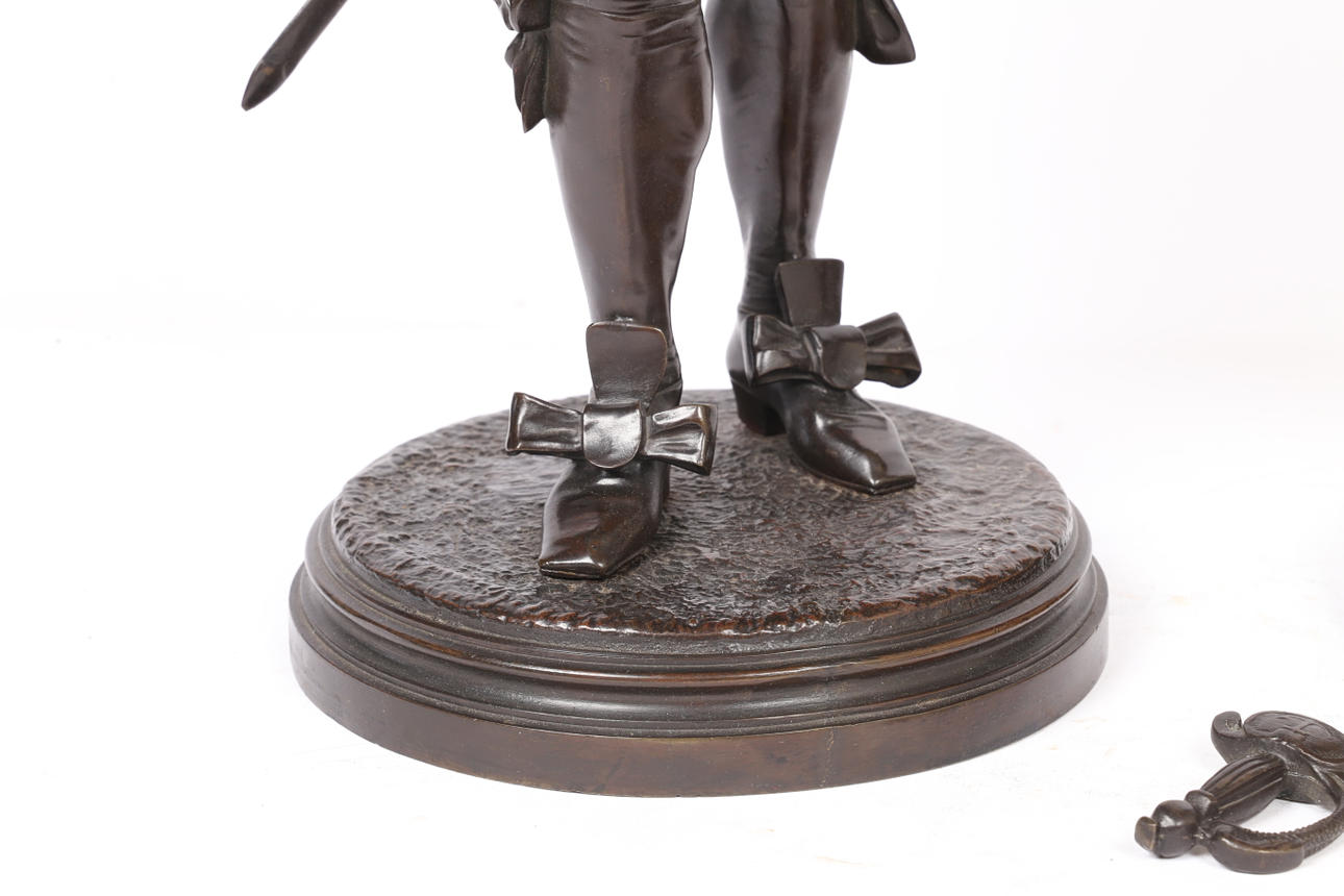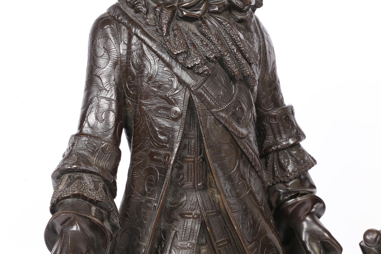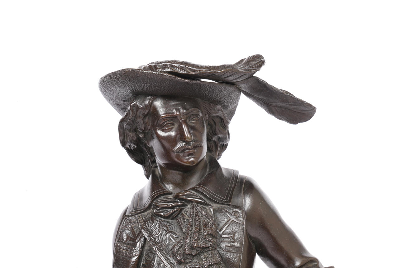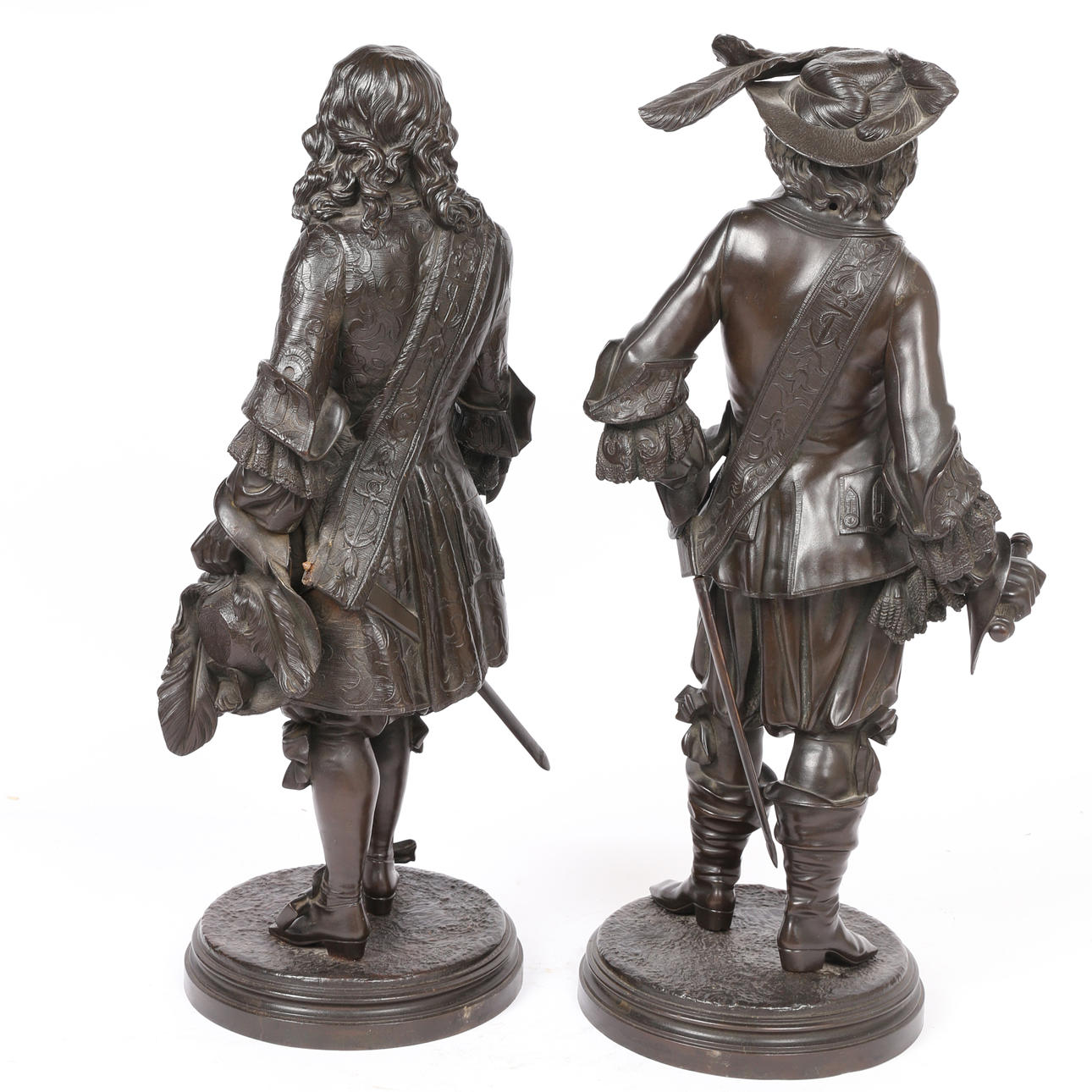 modellerad i stående positioner, den första bär en fjäderplymd hatt, hans högra hand håller en rulle, den andra håller sin fjäderluffade hatt till vänster och en rulle till höger, på naturalistiskt gjutna runda baser, 48 cm och 48,5 cm höga.