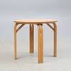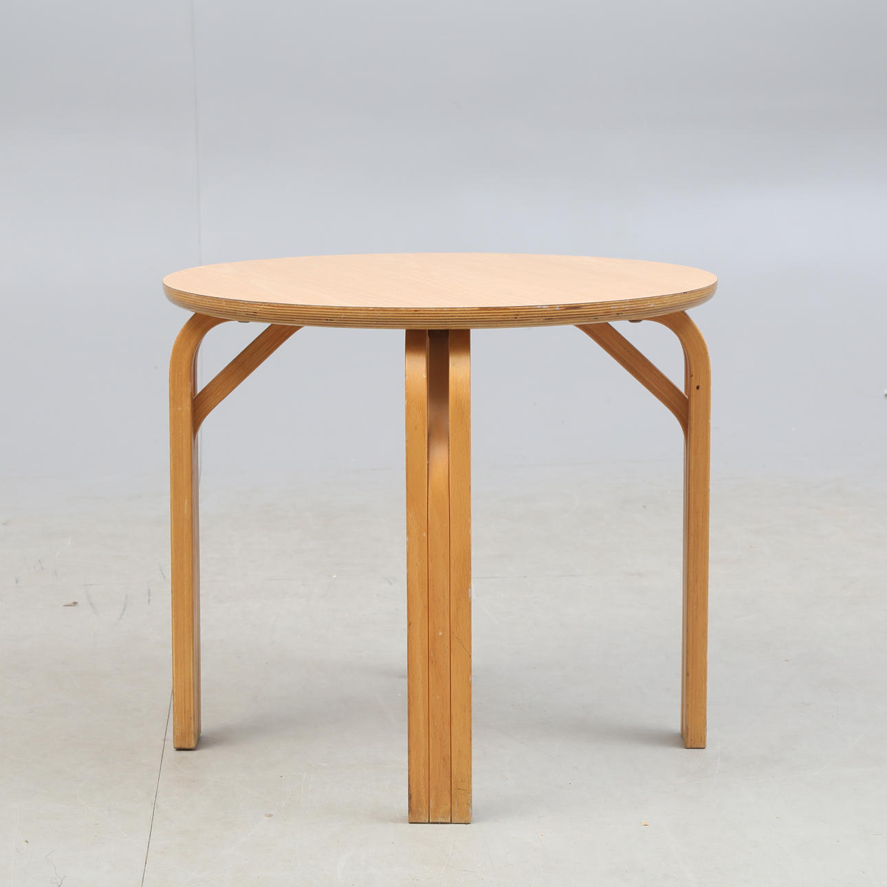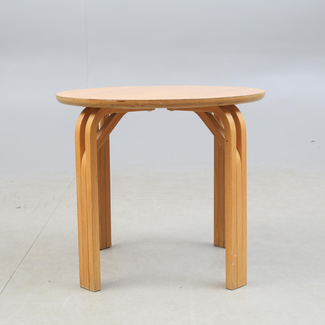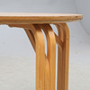 Ett soffbord med skiva i limträ och ben i böjträ.