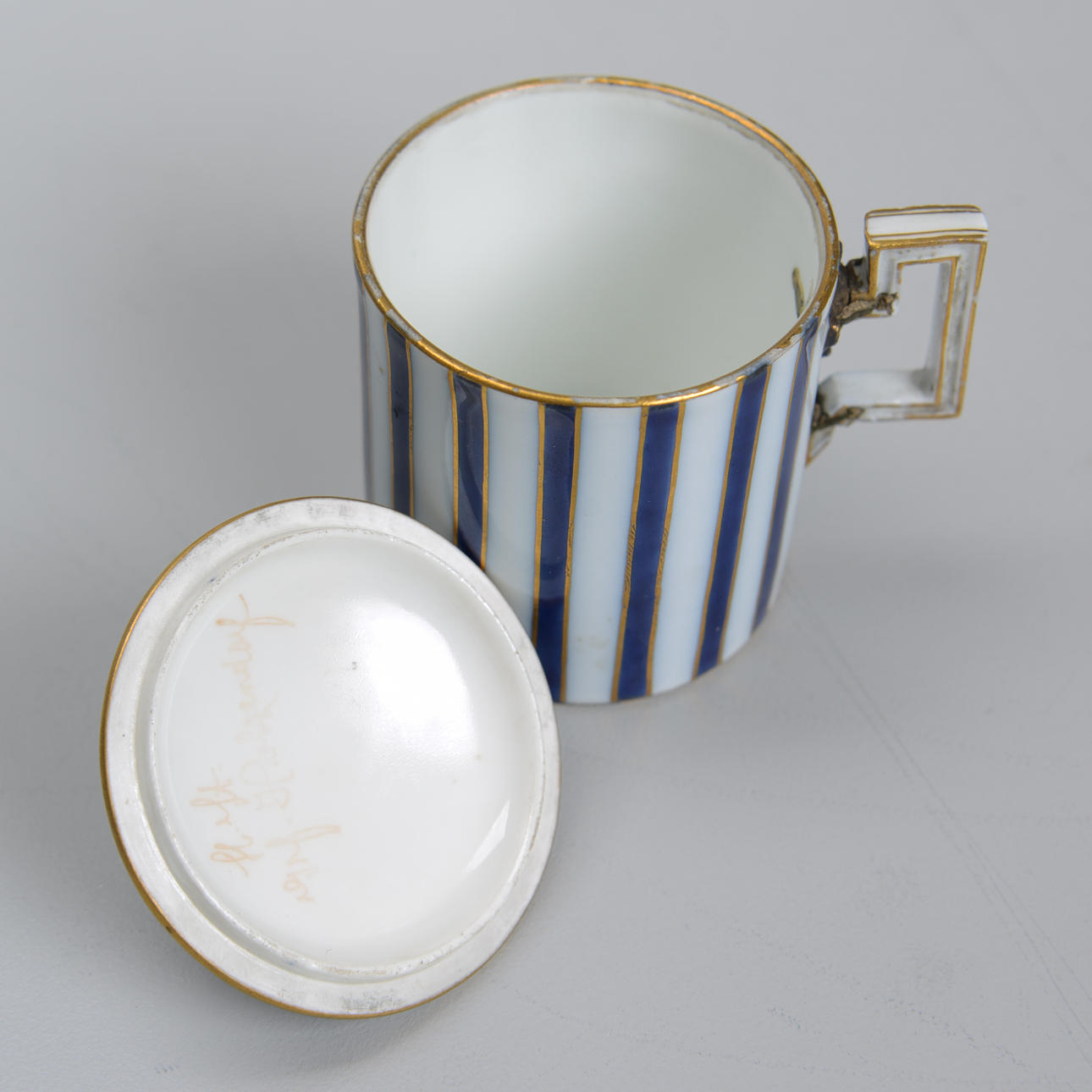 Kopp med lock samt underfat. Fatets Ø 14 cm. Koppens höjd, exklusive lock, ca 6,5 cm.
