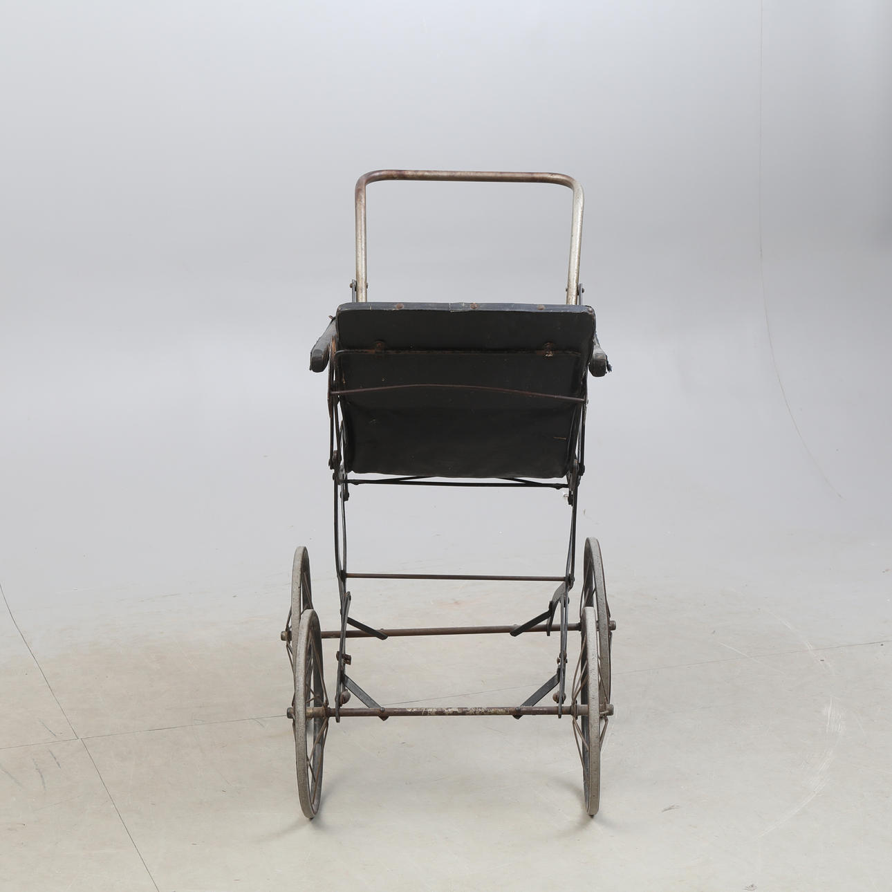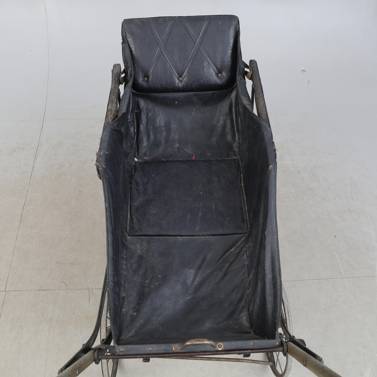 Antik barnvagn med metall chassi och läder klädd insatts.