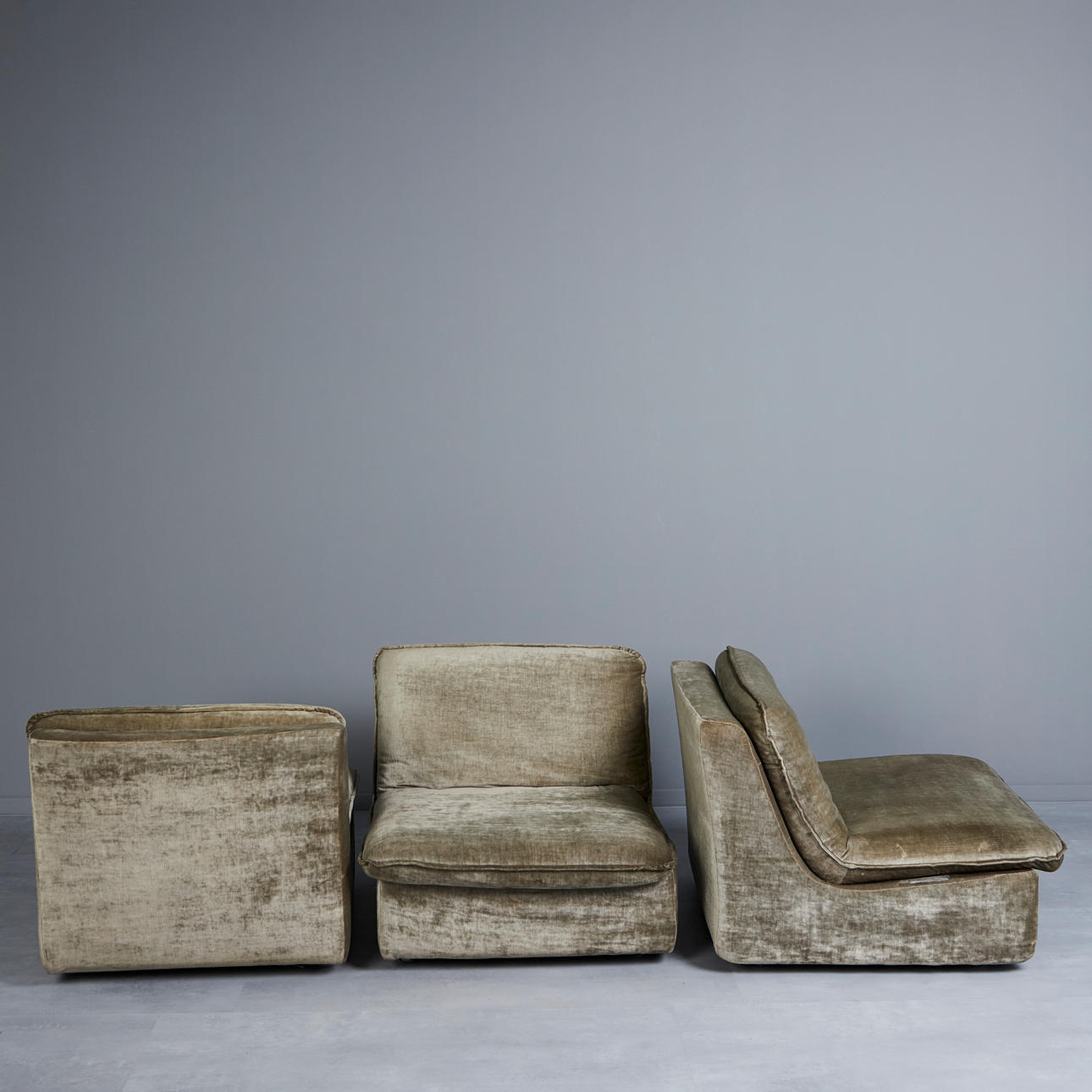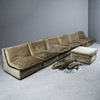 Sjudelad modulsoffa/soffa, sammet, 1970-tal. Ensemble bestående av sex moduler och en hocker, var och en med ett stoppat säte och ryggstöd täckt med salviagrön sammetstyg, med avtagbara sittdynor, fem nackstöd och hjul, h.35-65cm, sitshöjd: 35cm, W.75cm, D.80cm. (7).