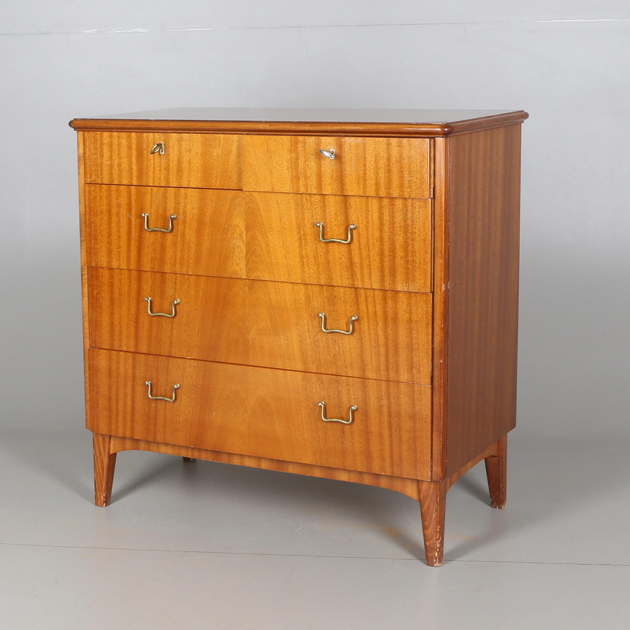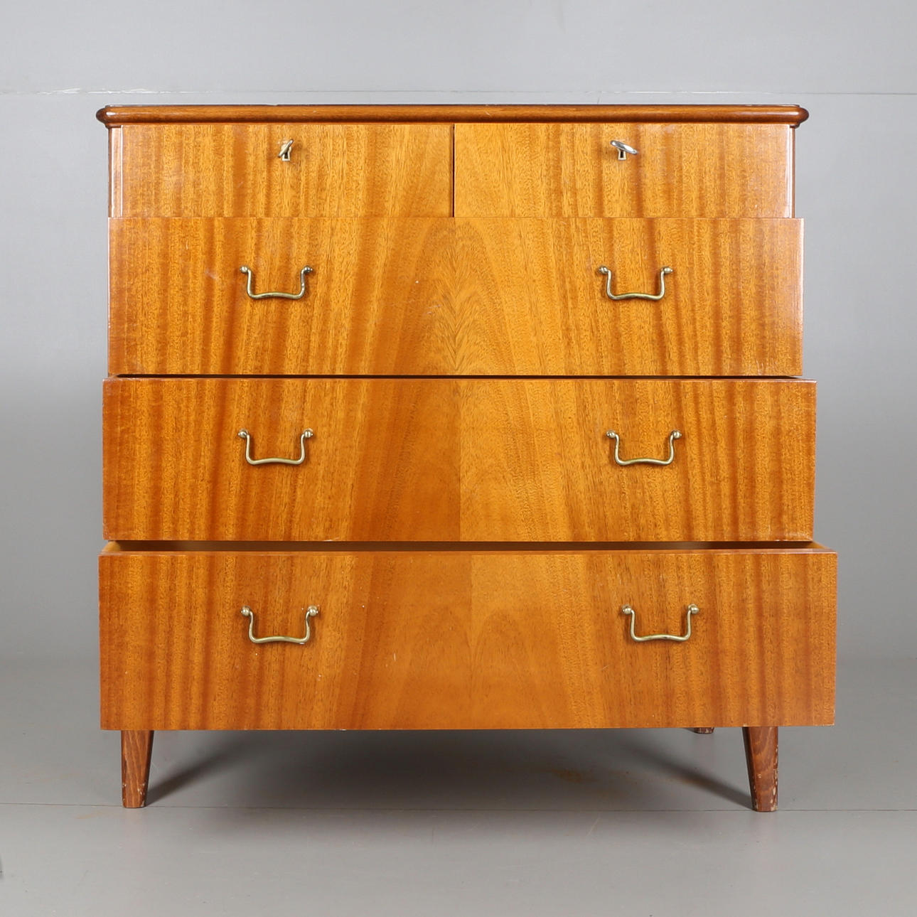 Handtag av mässing. Fem lådor, varav två mindre.