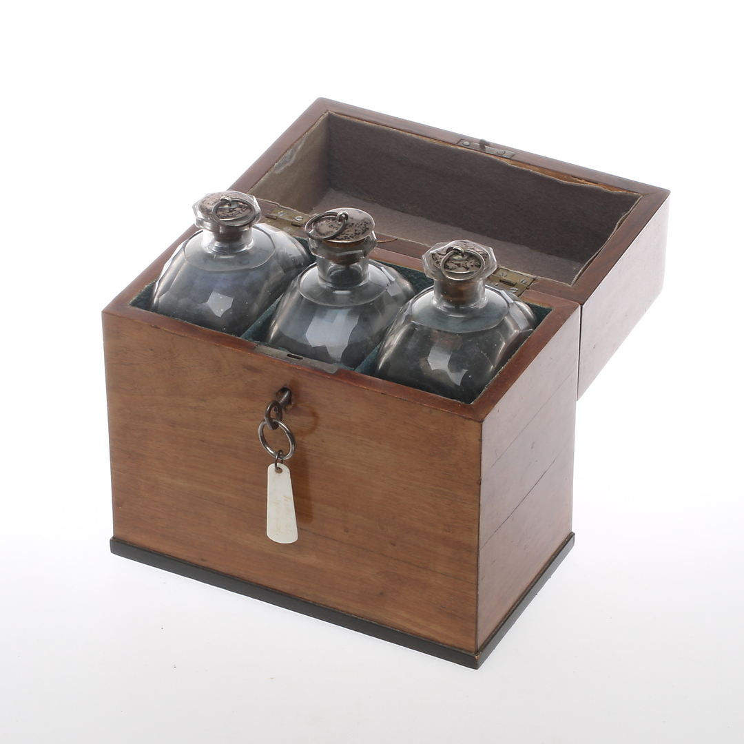 328261. FLASKOR 3 st glas i schatull, 1800-tal.