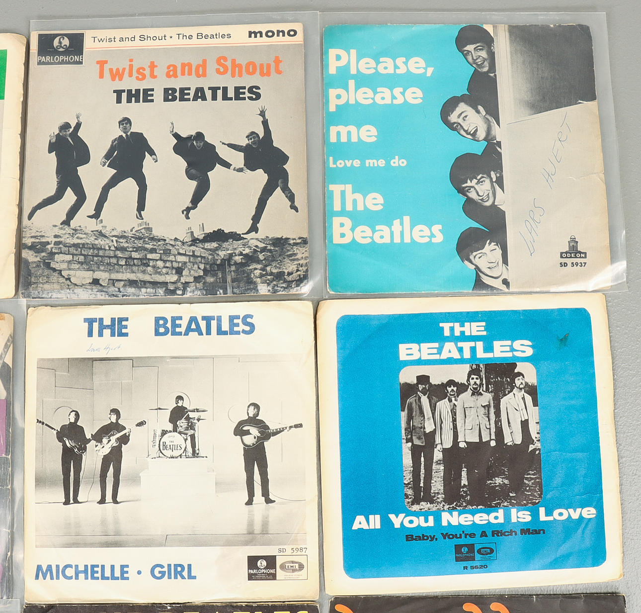 Bruksslitage. Flera omslag med namnteckning, även några skivor. revor och skador förekommer. Skicket på skivorna ej kontrollerat.