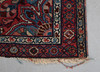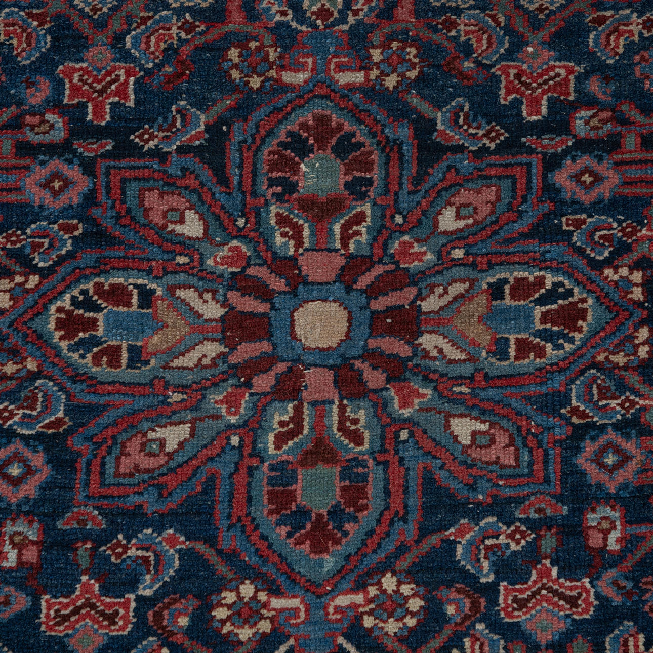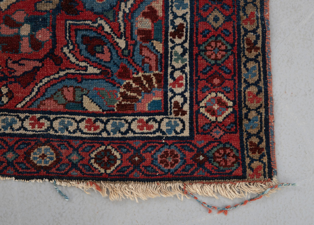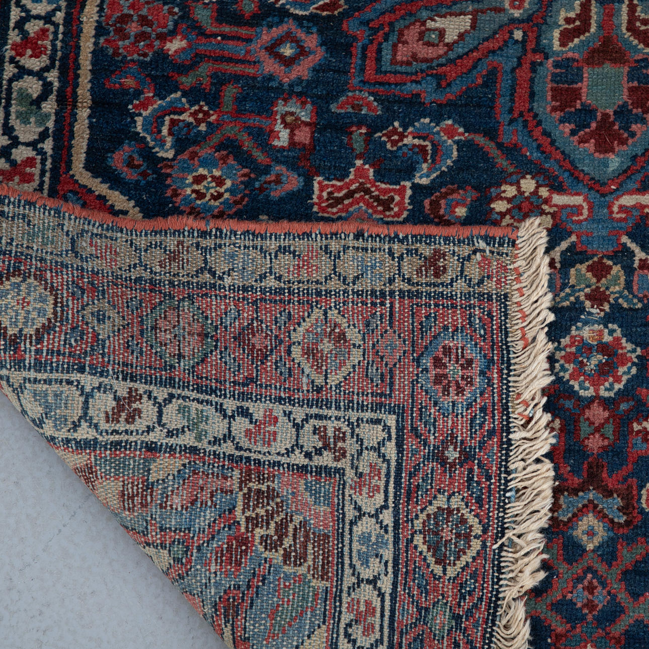 ull på bomull Blå huvudpanel med polykroma dekorationer, inklusive geometriska Herati-mönster och central passiv medaljong. LxB 132 x 100 cm.
