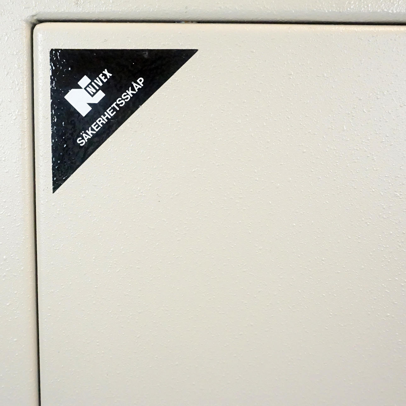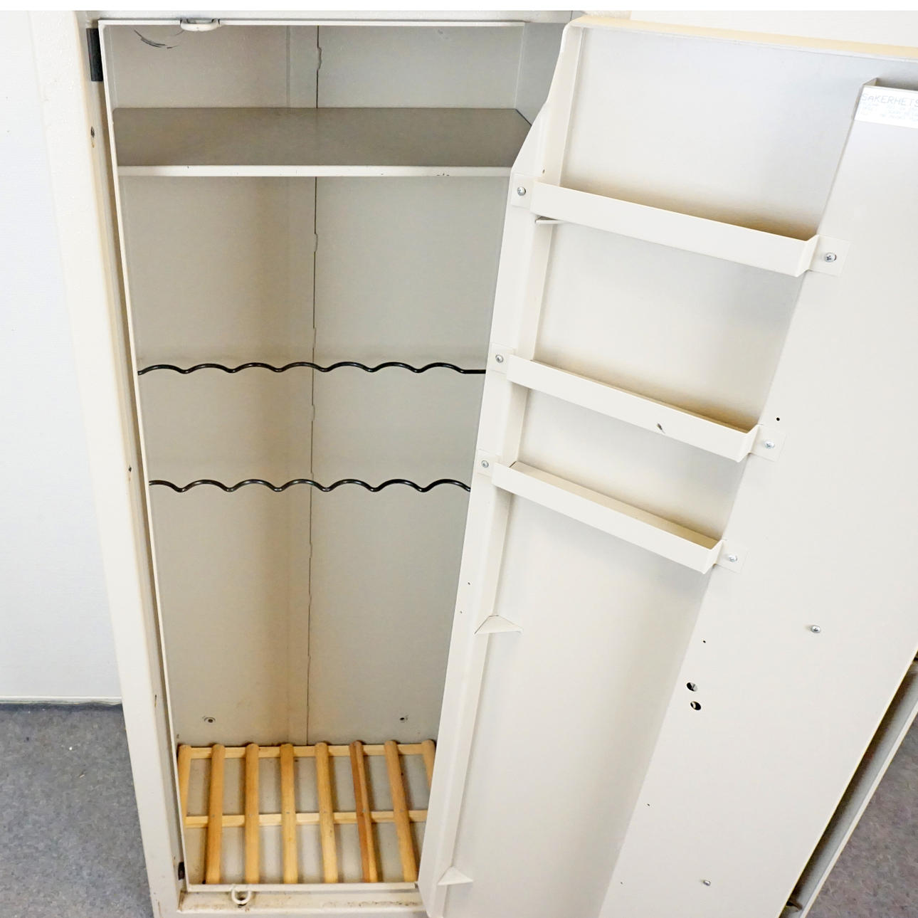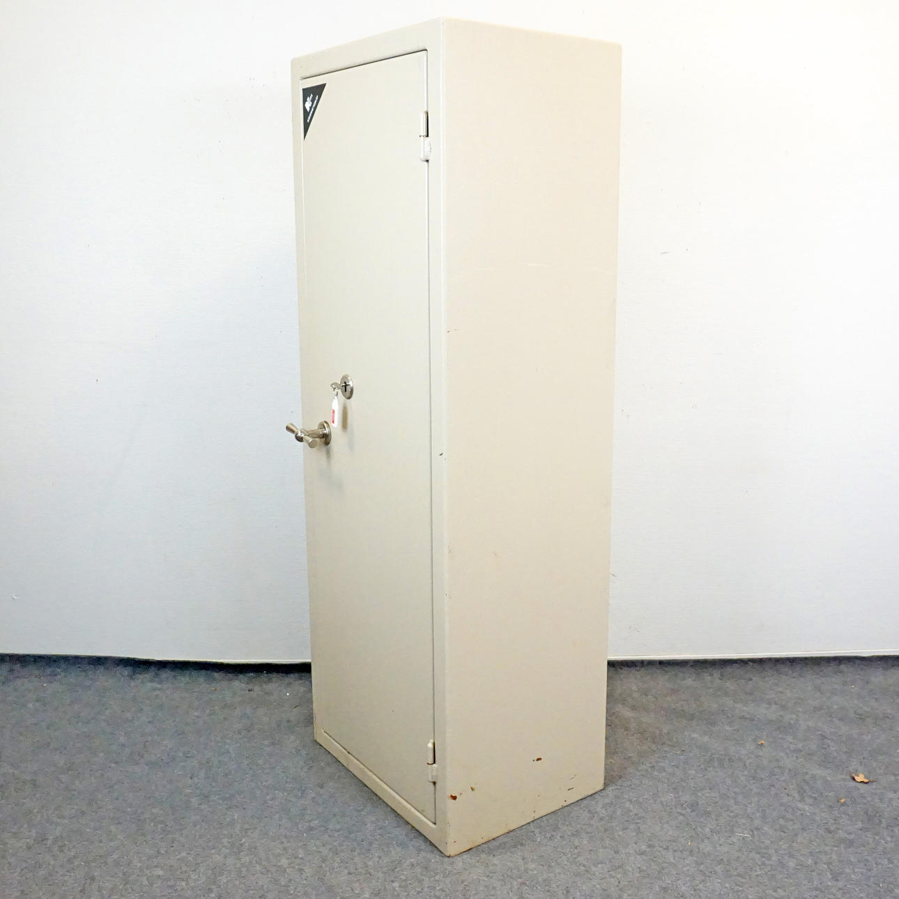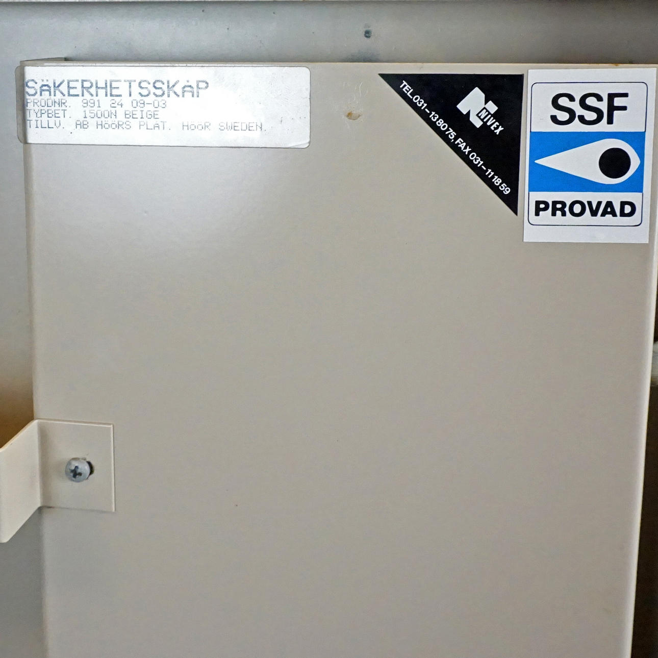 SSF märkt, säkerhetsskåp, produktnummer 9912409-03, typbeteckning 1500 N, tillverkat av Höörs plåt AB. Höjd 150 cm, bredd 55 cm, djup 40 cm.