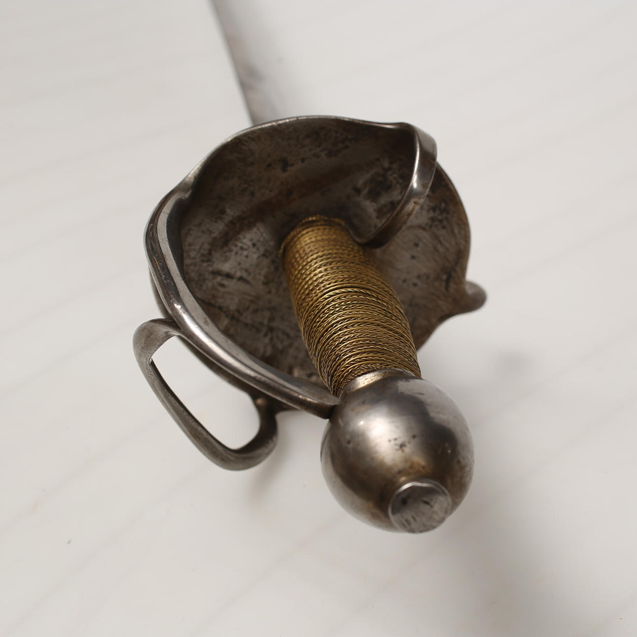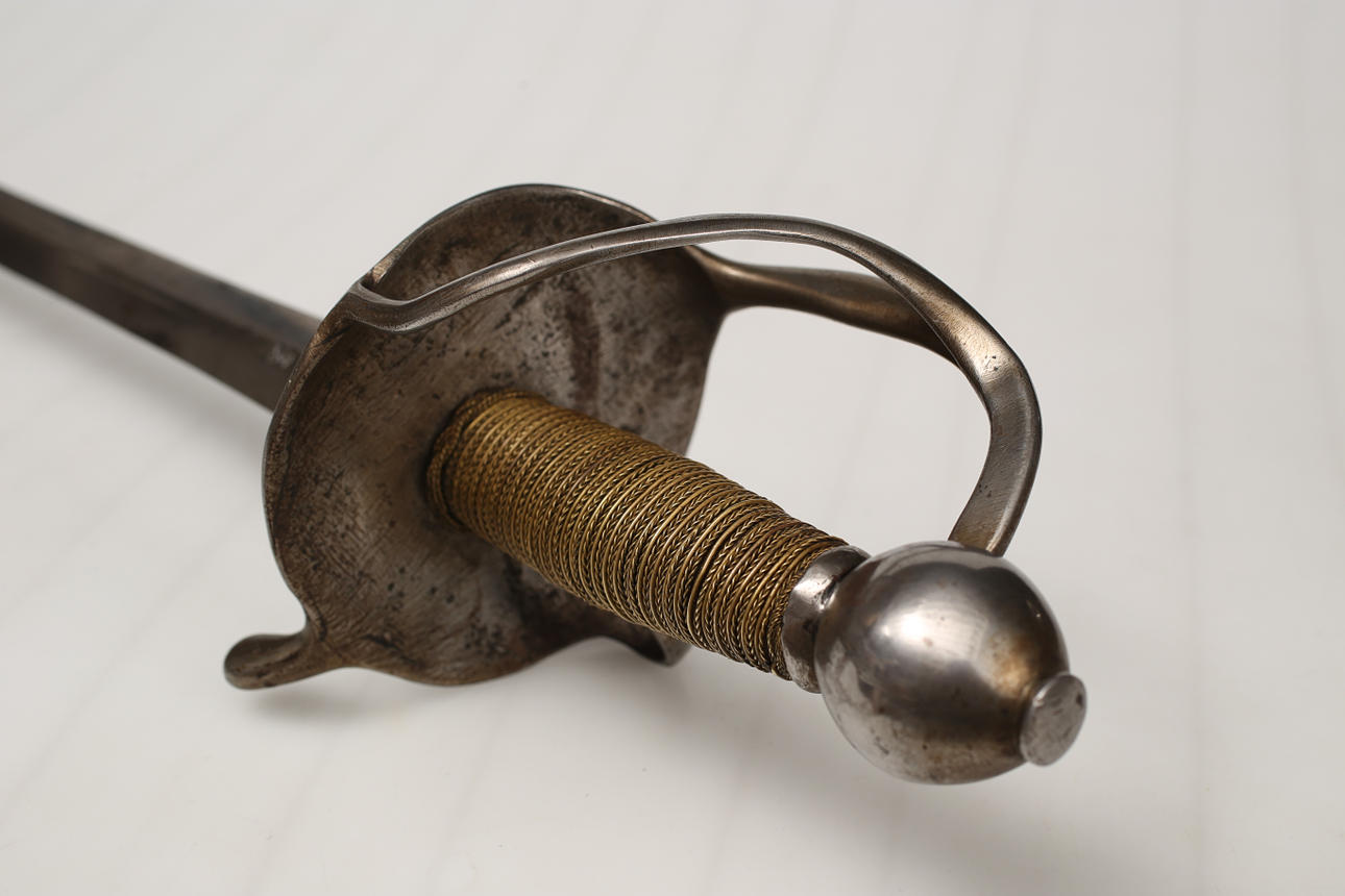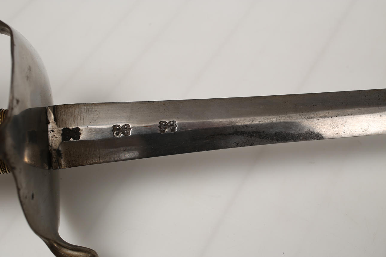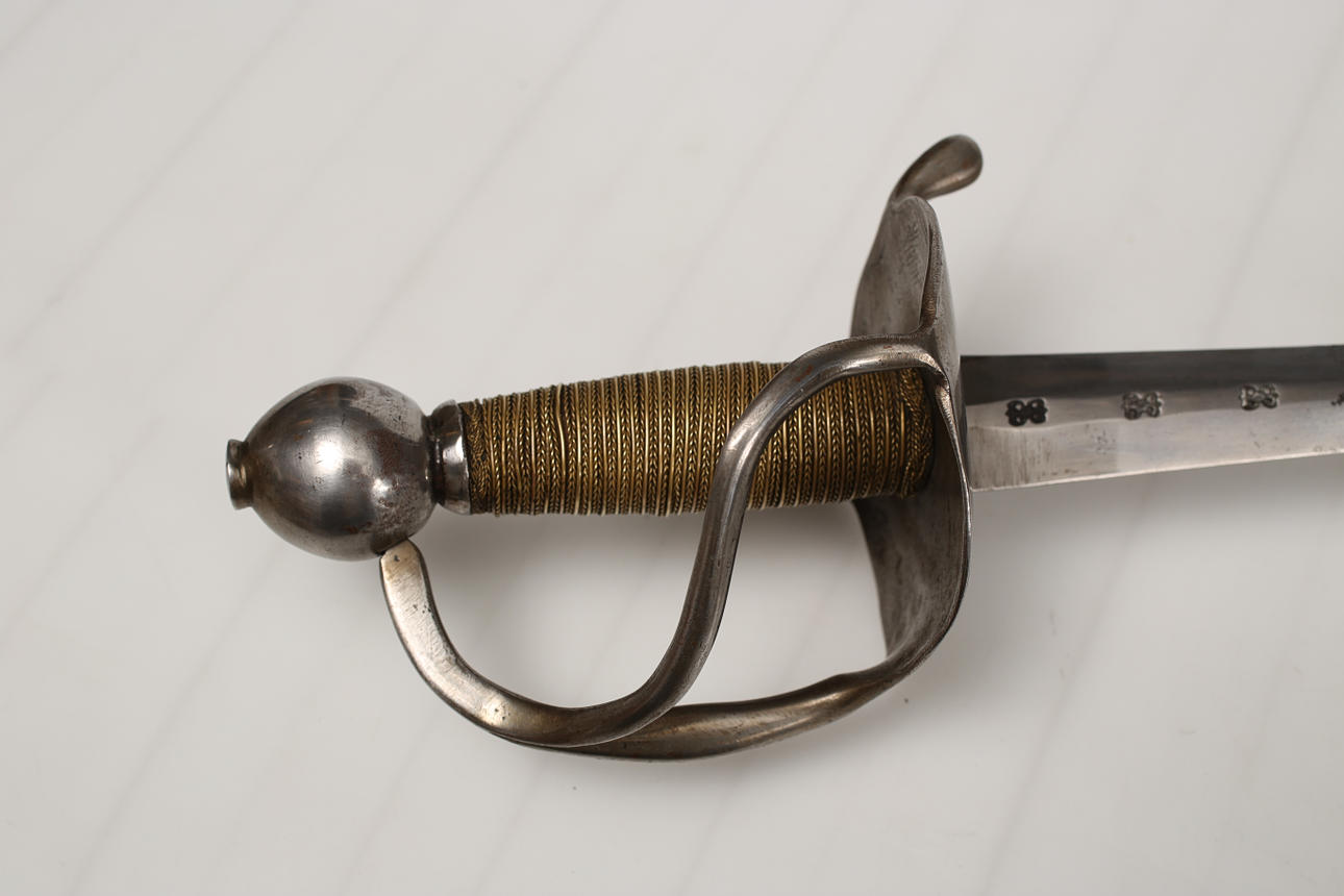 Även kallad komissvärja. Polerat fäste i järn med tumbygel. Klingans längd 81,5 cm (något avkortad under brukstid) Wira-stämplar.