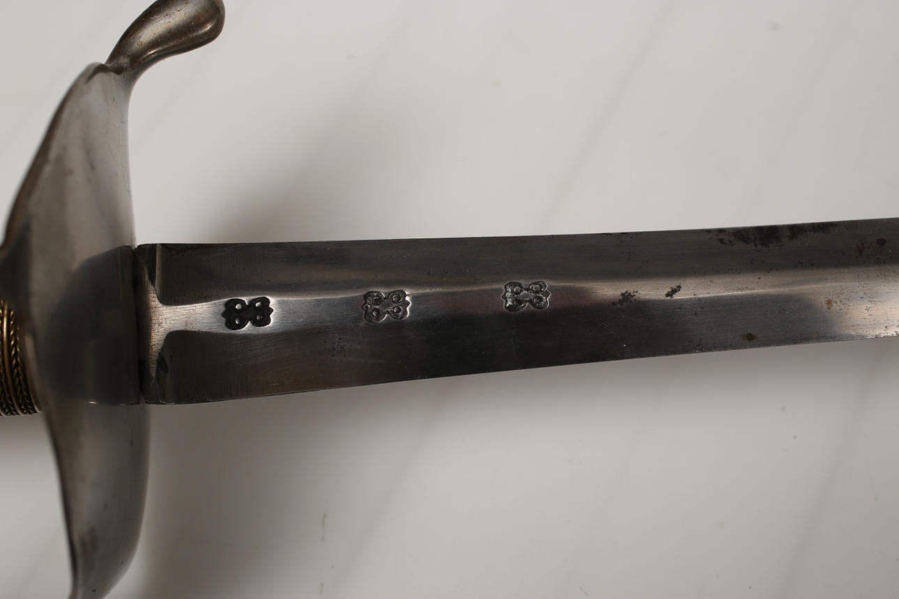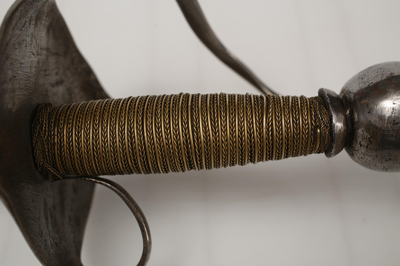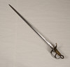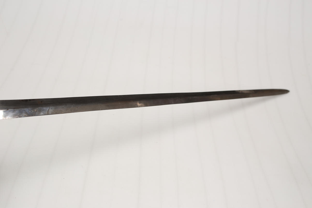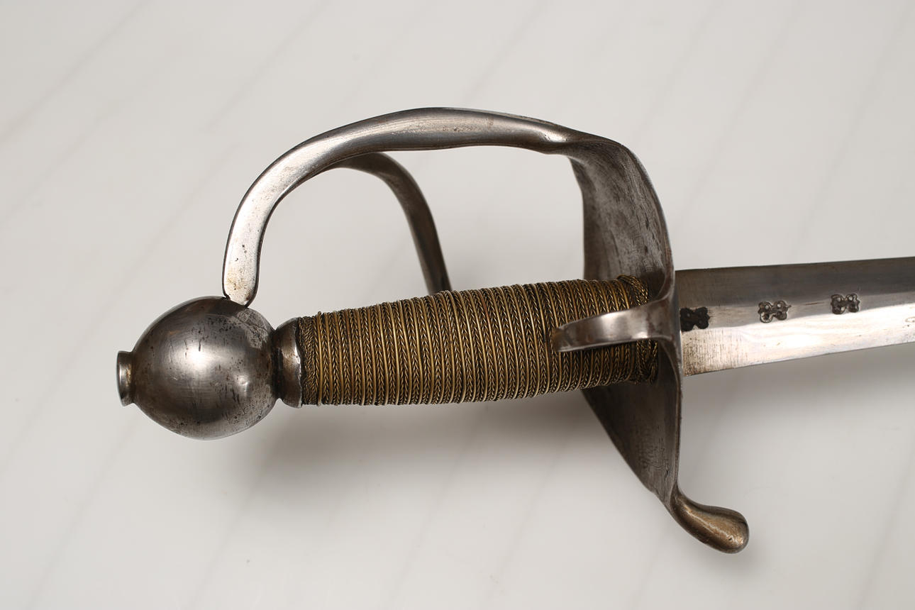 Även kallad komissvärja. Polerat fäste i järn med tumbygel. Klingans längd 81,5 cm (något avkortad under brukstid) Wira-stämplar.