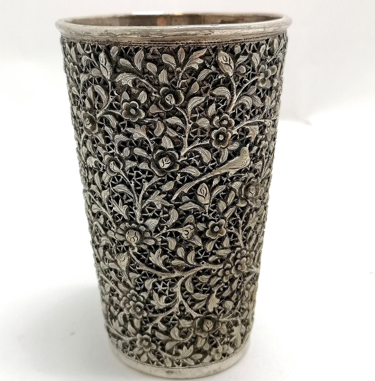 Antik vit metall östlig bägare med djup och riklig dekoration - 12 cm hög & 285 g.