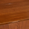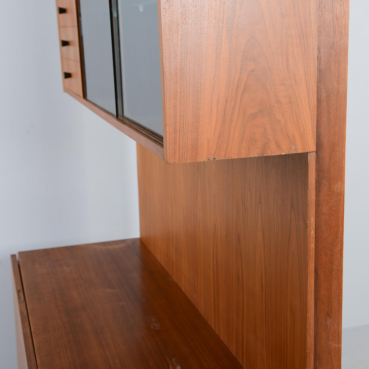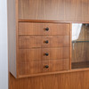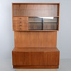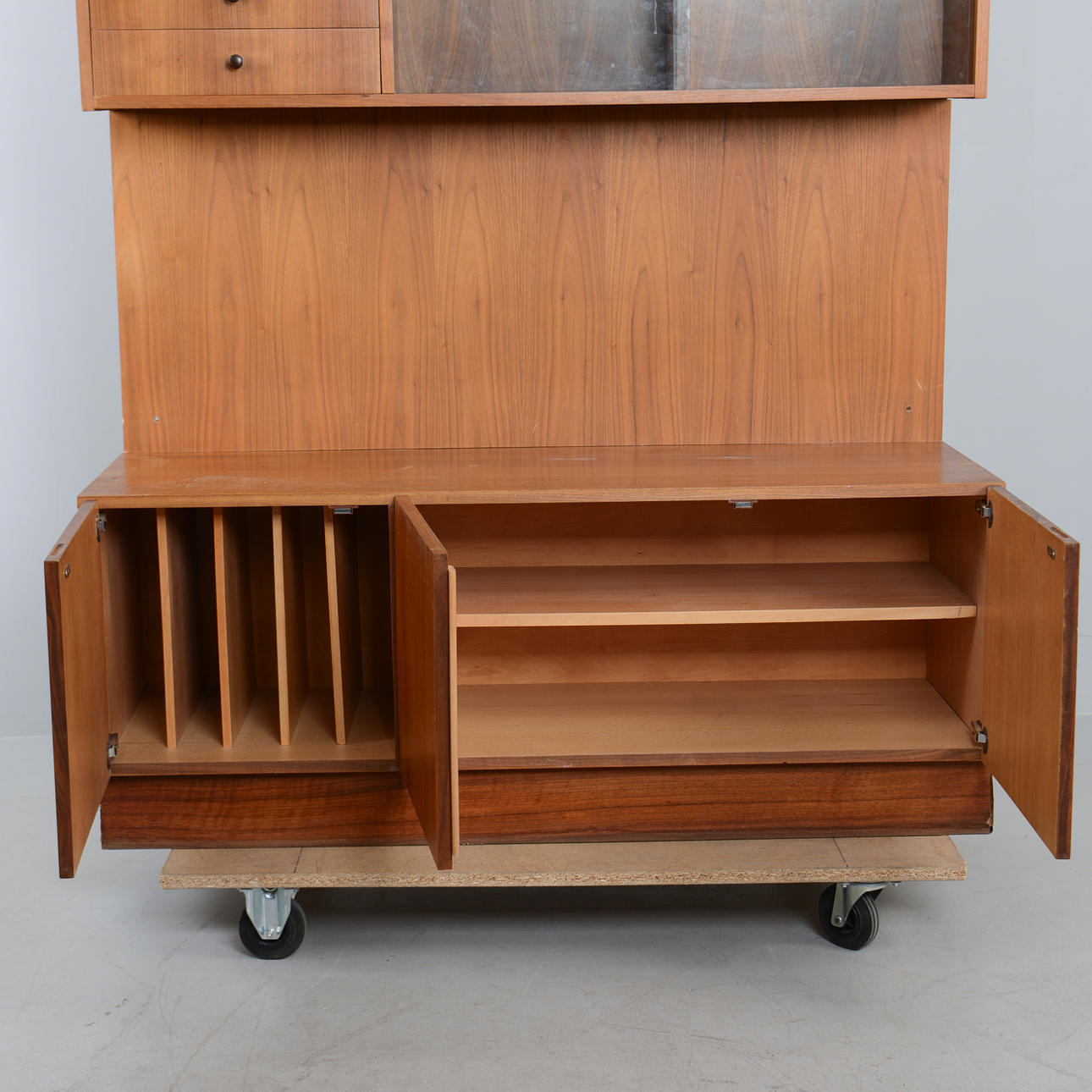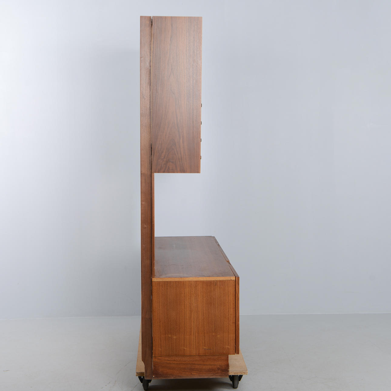 Fanerad i valnöt. Överdel med vitrin samt fyra lådor. Underdel med skåp och bakomliggande hyllplan.