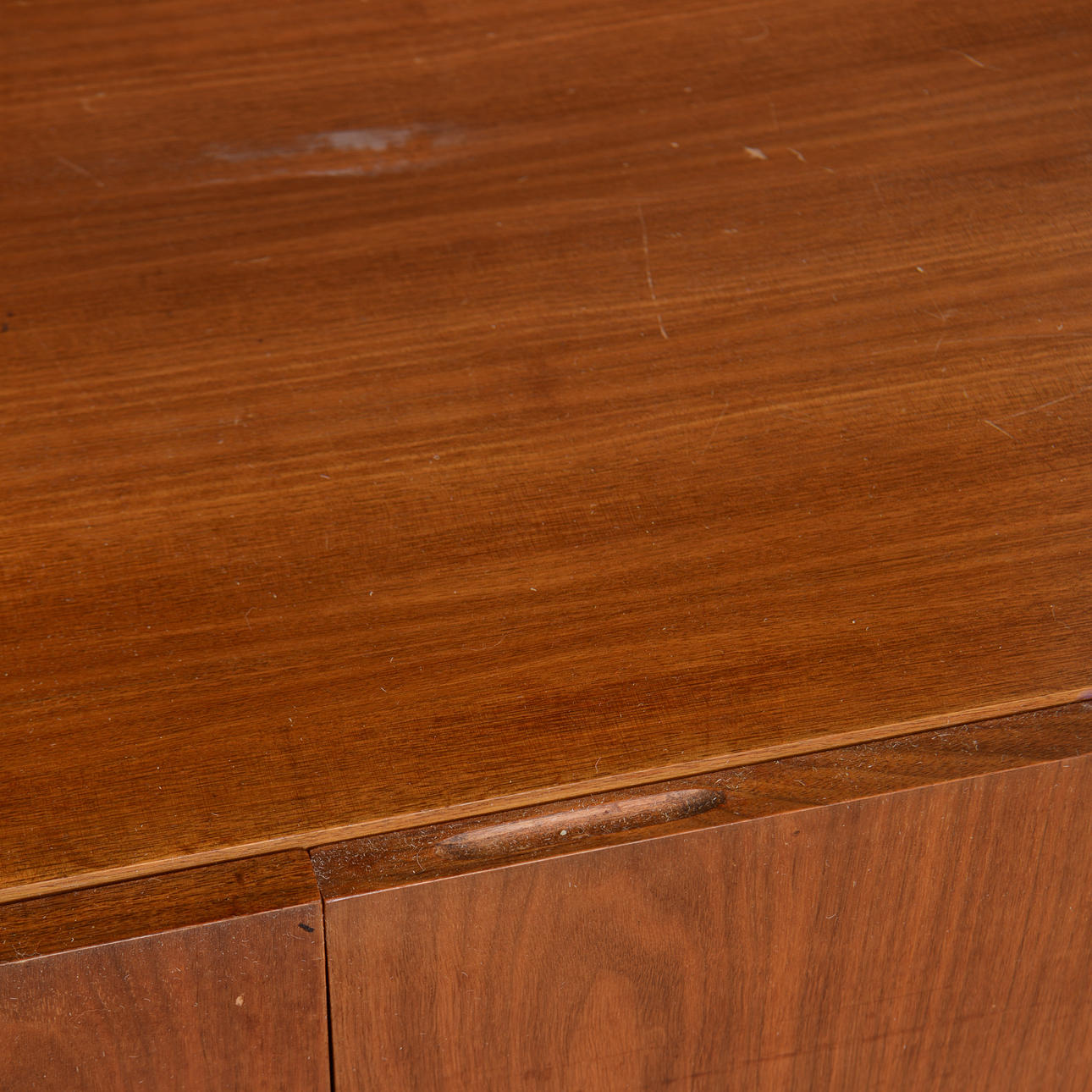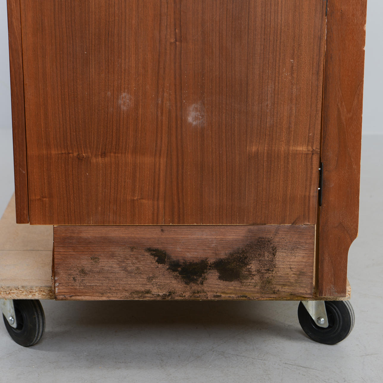 Slitage. Repor och slagmärken. Fanerskador. Ställvis omfattande fuktskada på en kortsida.