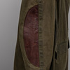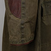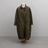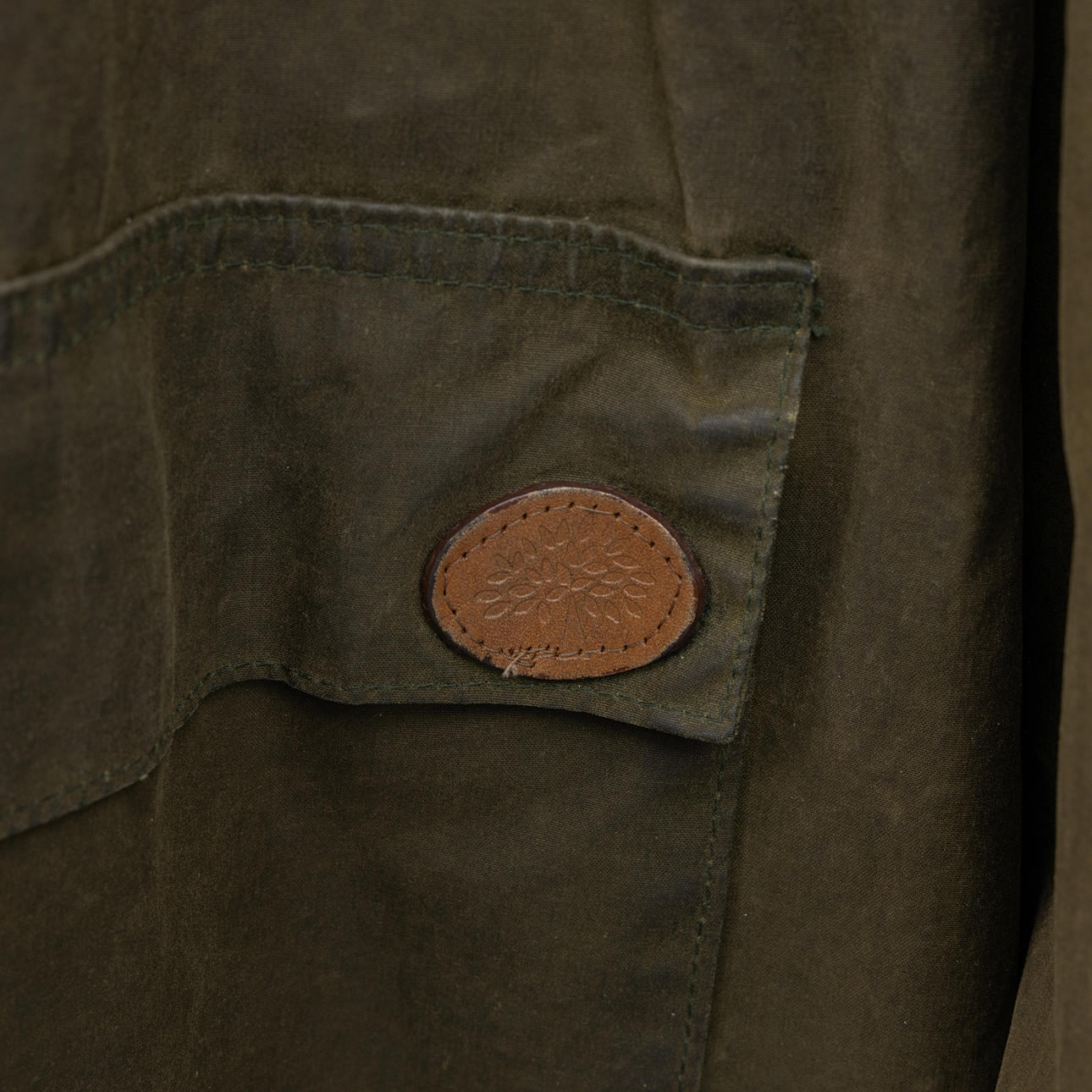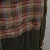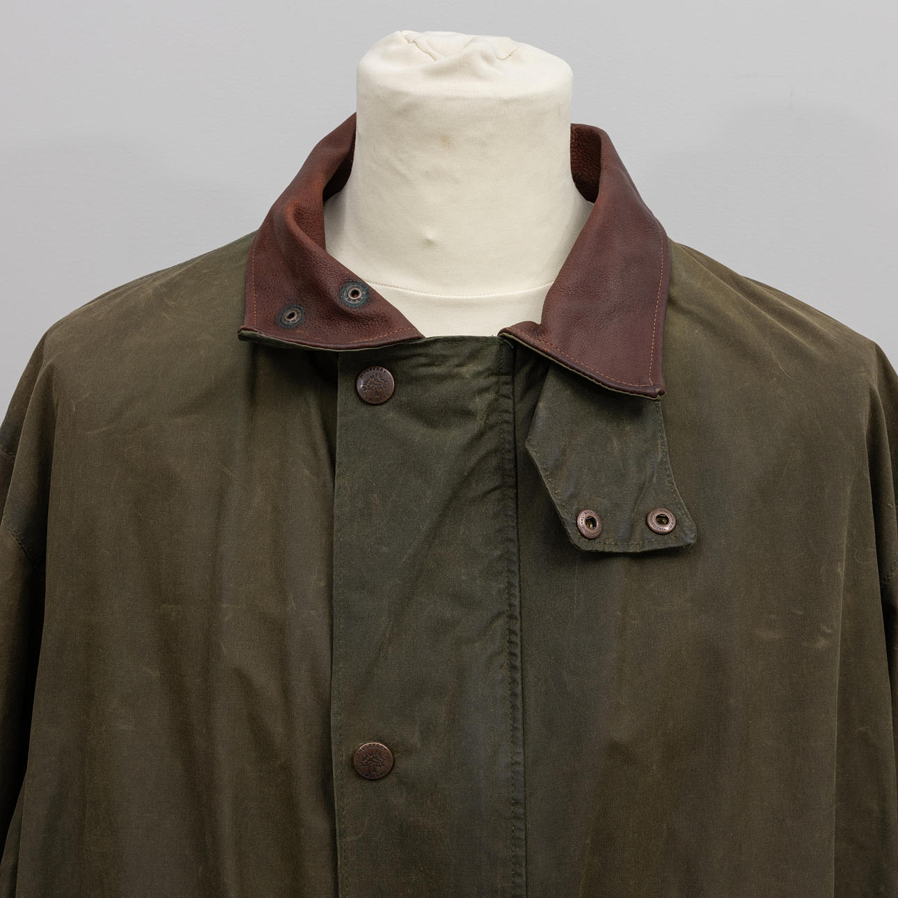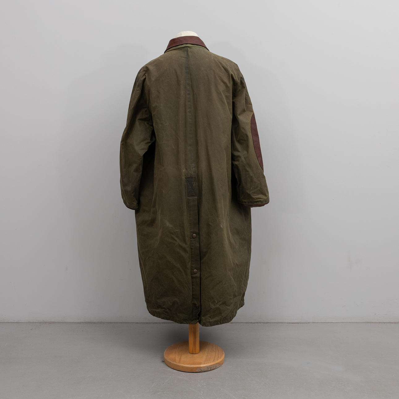 Grön, lång vaxad med krage av skinn. Skinnskodda ärmar. Längd från axel, ca 123 cm.