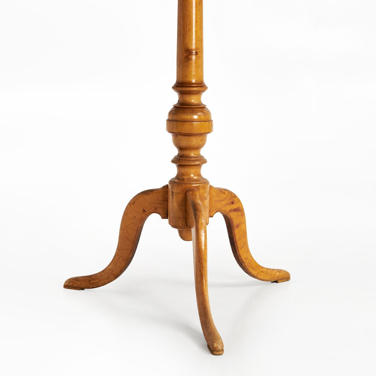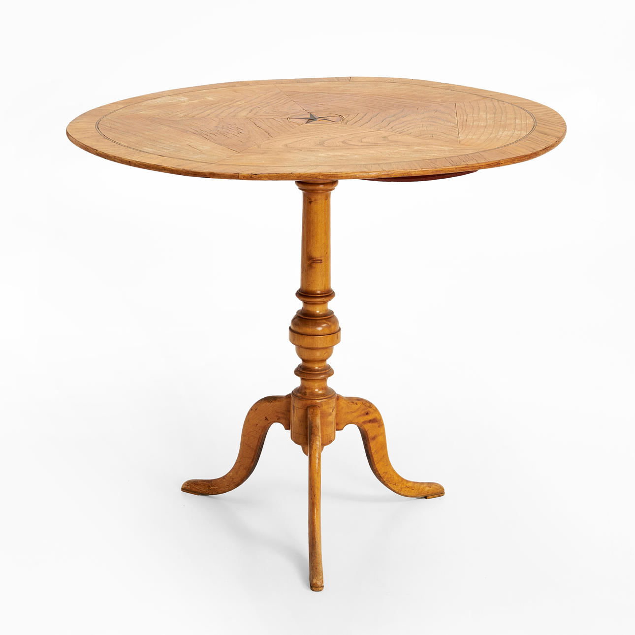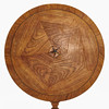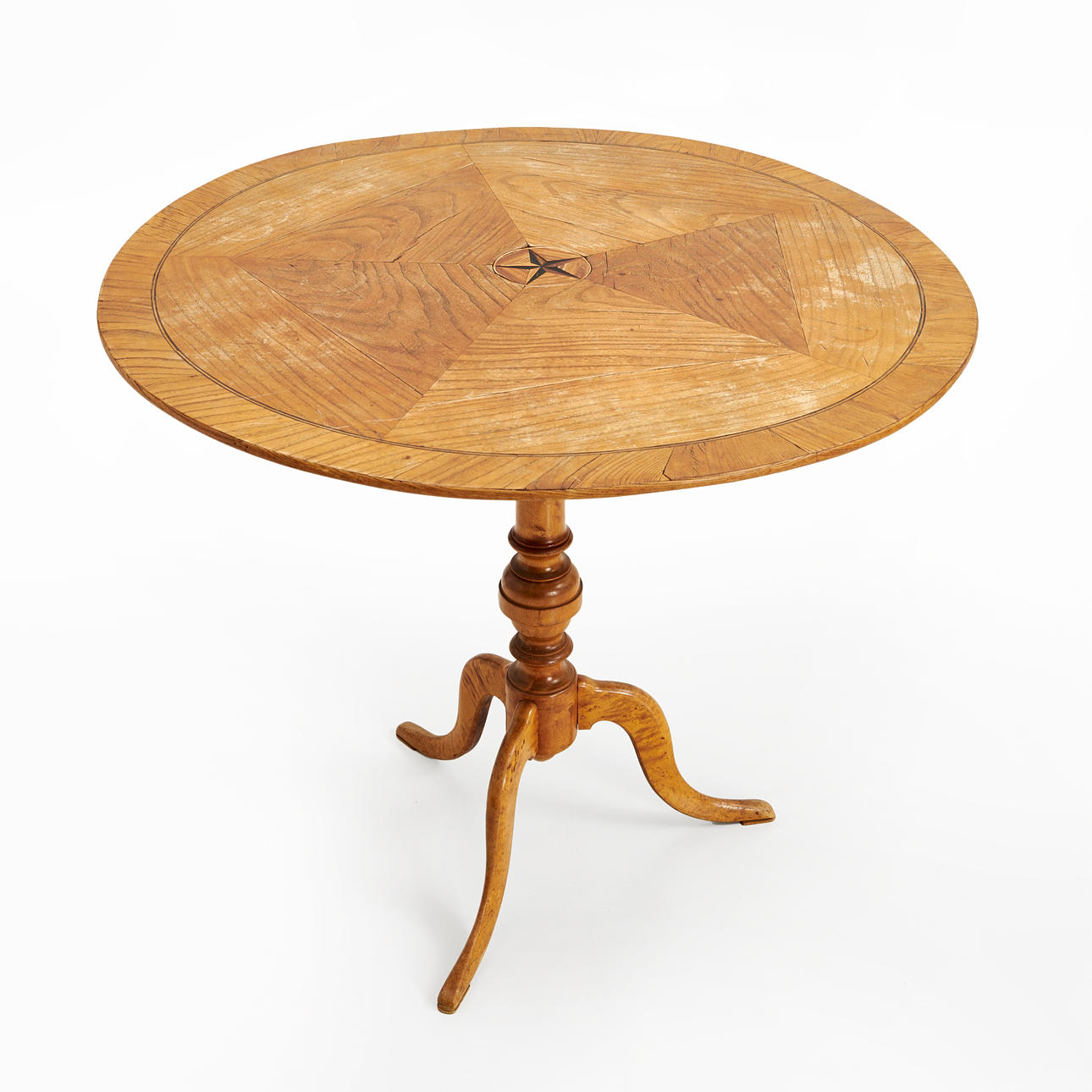 Fanerat i mahogny, alm m.m., intarsia med nordstjärnan. Höjd 77, diameter 88cm.