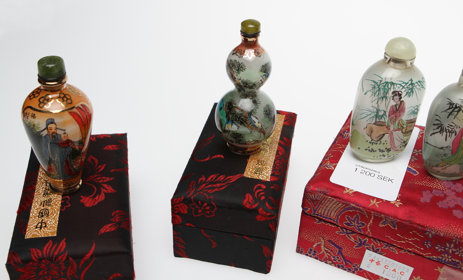 32937. SNUSFLASKOR, 4 st samt FLAKONGER, 4 st, Kina, 1900-tal.