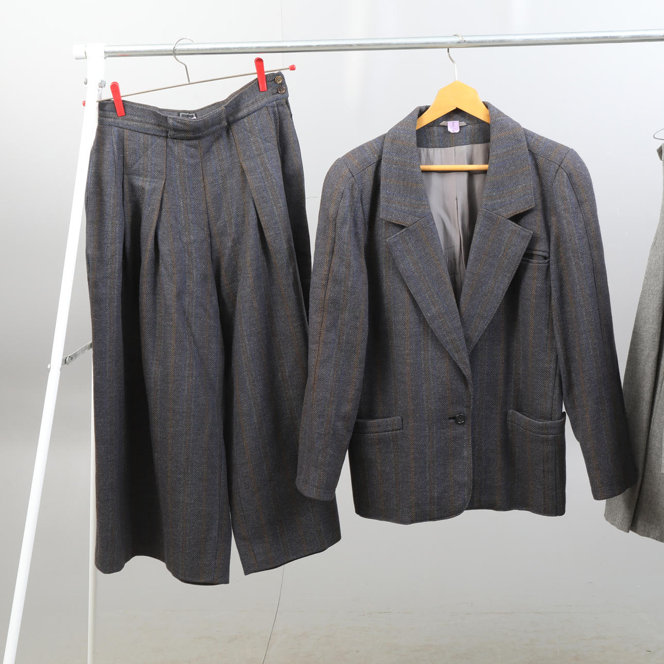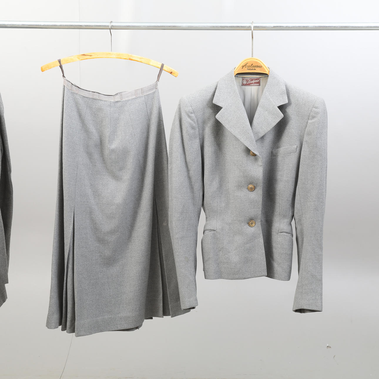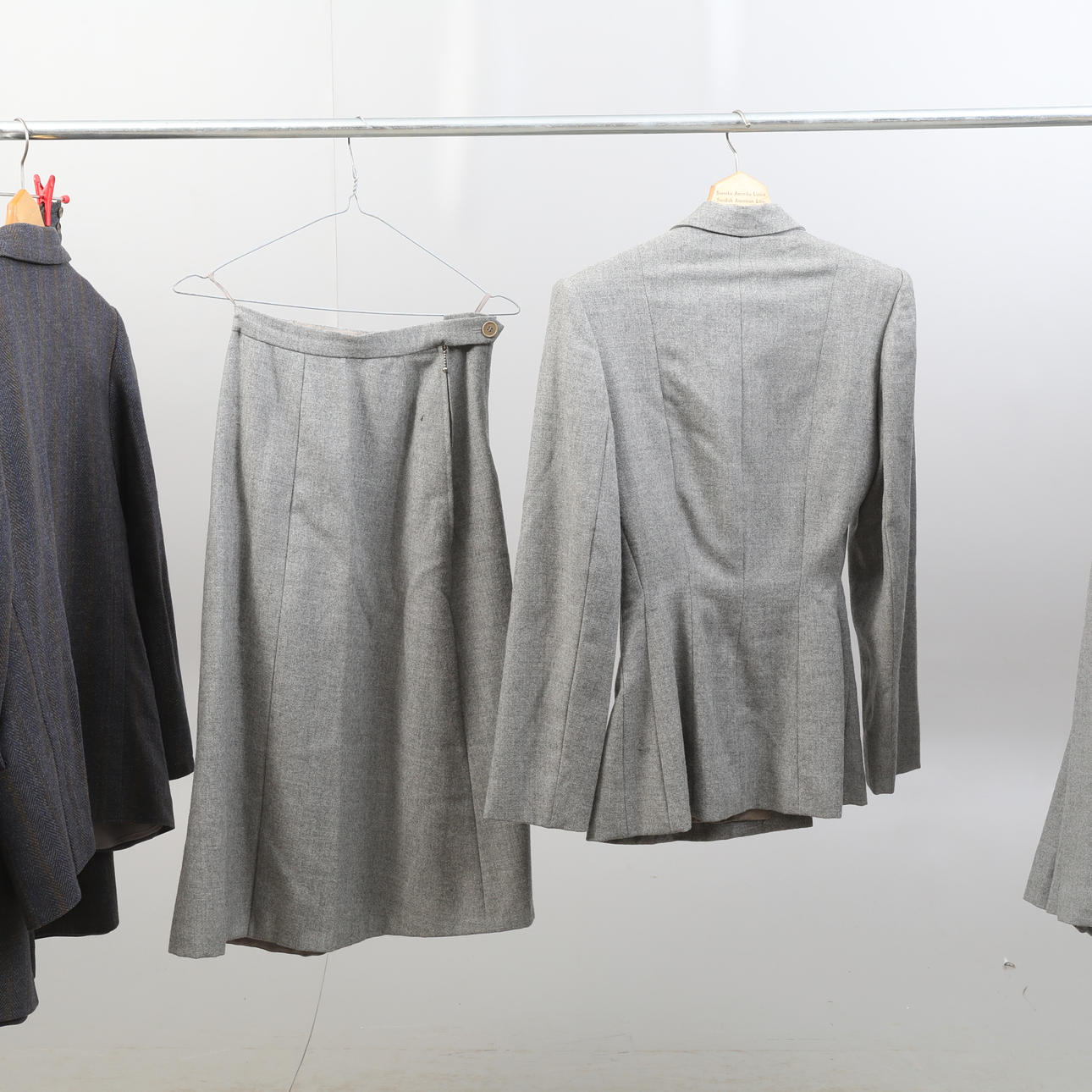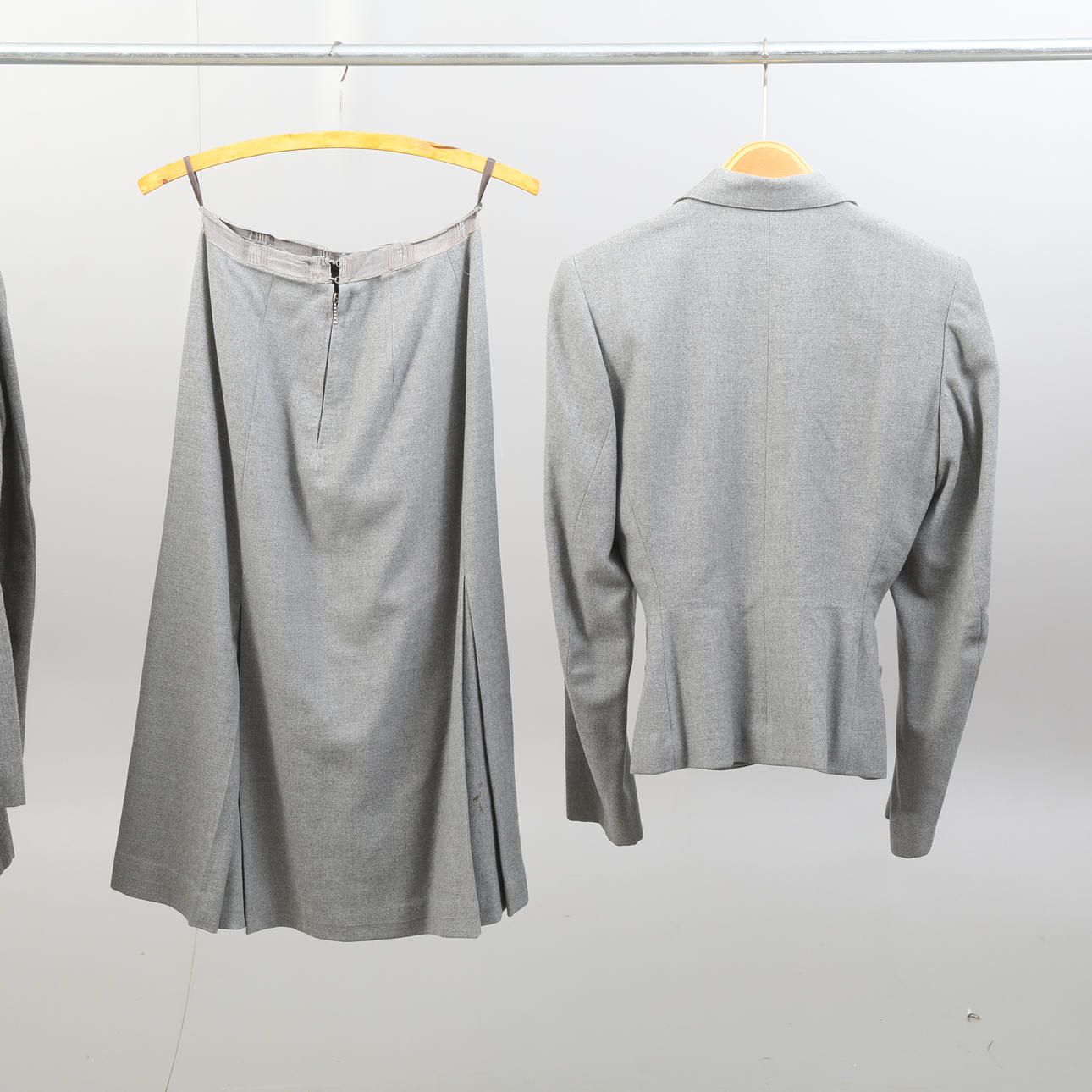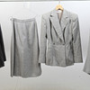 Tre kostymer, damkavajer med tillhörande kjol och byxkjol. En udda kavaj. Ylleblandning förekommer. Några av plaggen är märkta med storlek 42.