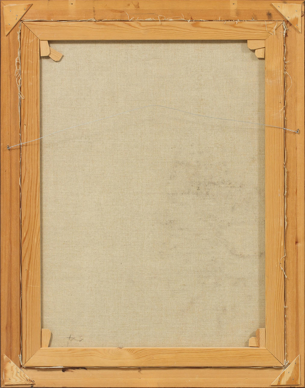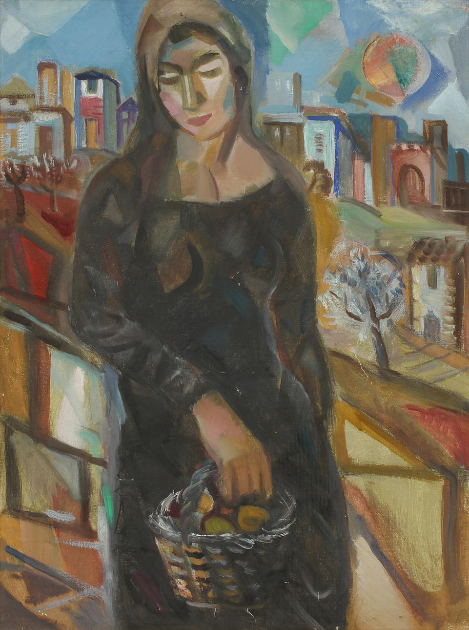 Kvinna med fruktkorg med sydländskt landskap i bakgrunden. 75x56.