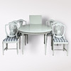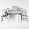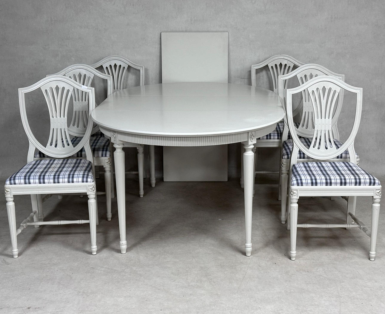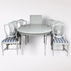 Matbord med 1+2 iläggsskivor. Höjd 74 cm, diameter 110 cm. Iläggsskivor 48 cm.
