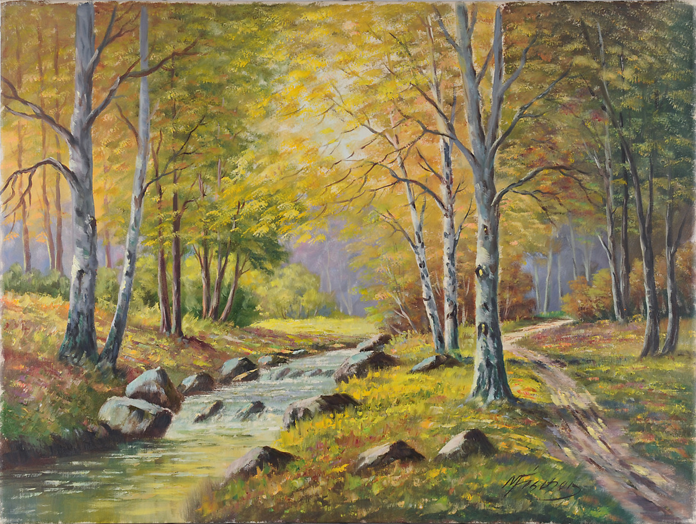 330624. SIGNIERT M. FISCHER. Trädbevuxet landskap med bäck.
