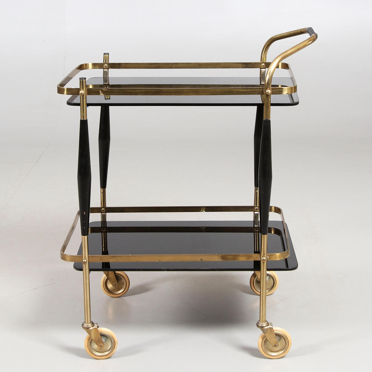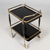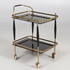 Serveringsvagn med rörstomme i mässing, skivor i svart glas.
