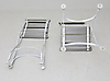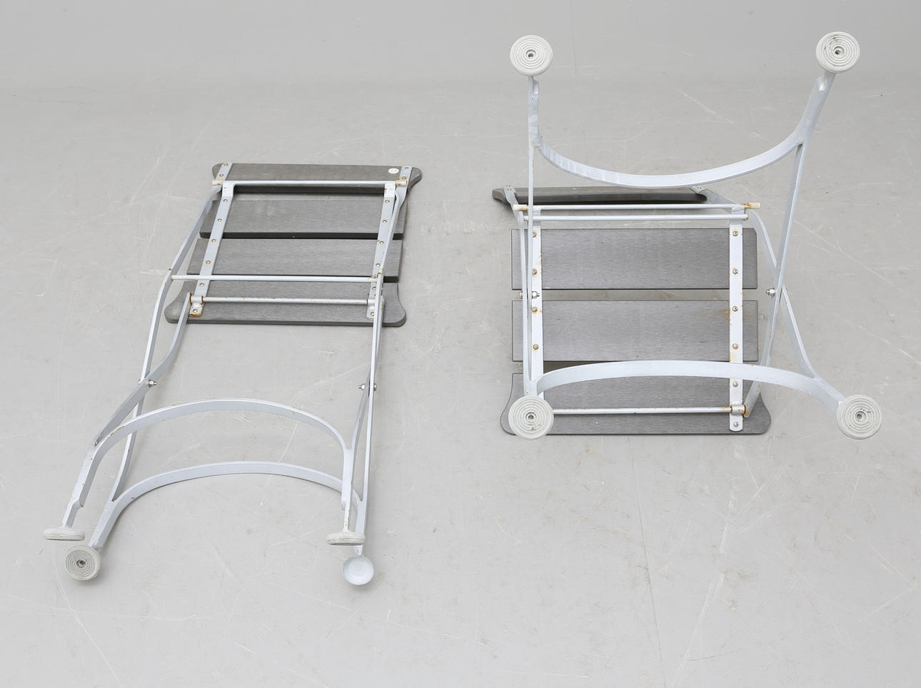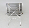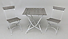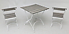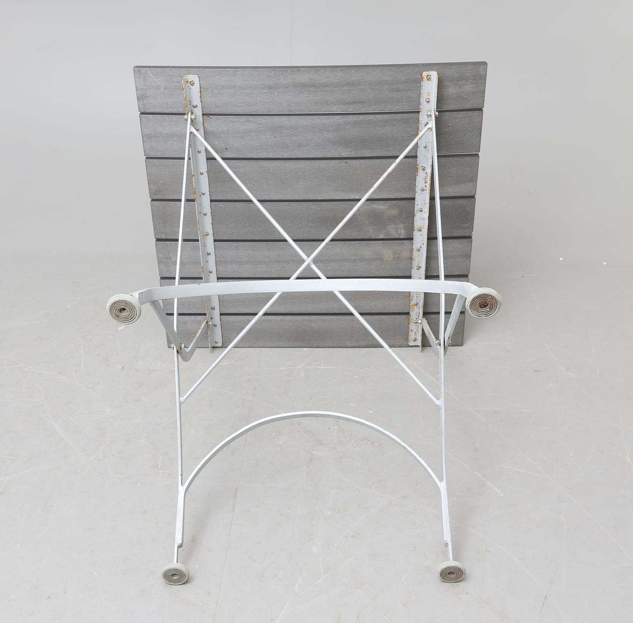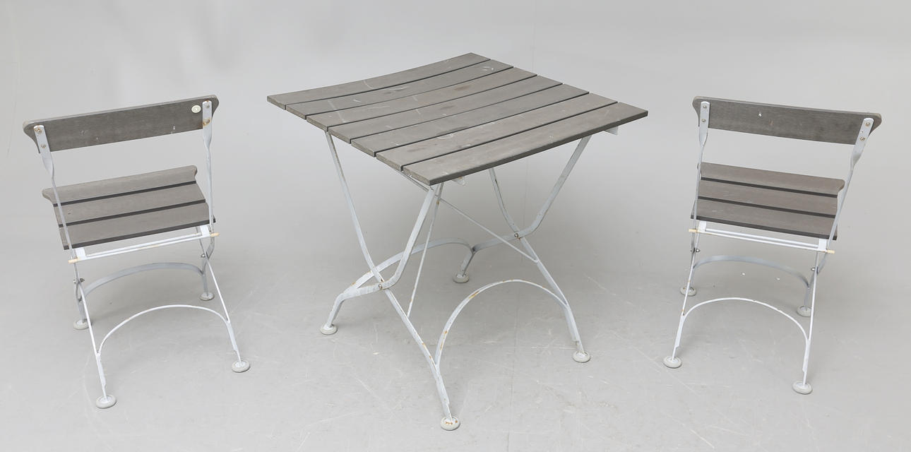 Hopfällbara modeller. 2 Stolar, Rygghöjder: 82 cm. Bord, Längd: 70, Bredd: 70, Höjd: 73,5 cm.