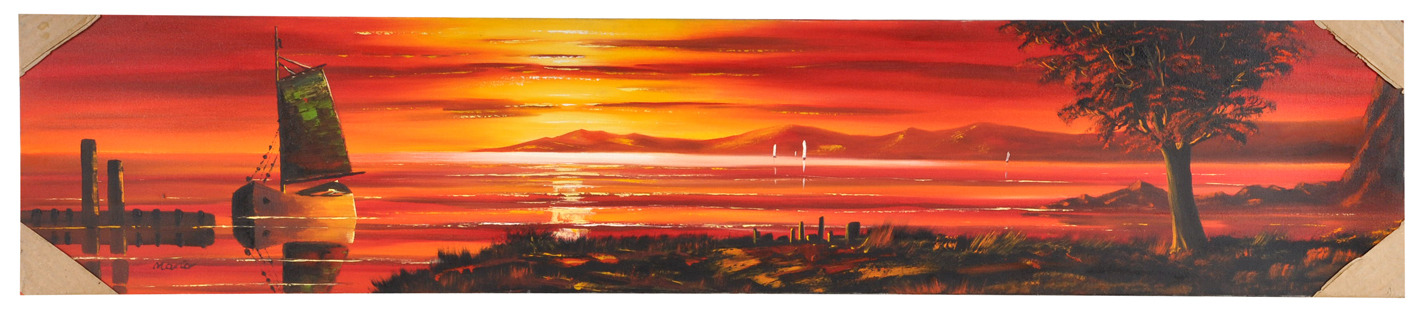330832. SIGNIERT MARIO. Röd glödande vik med segelbåtar.