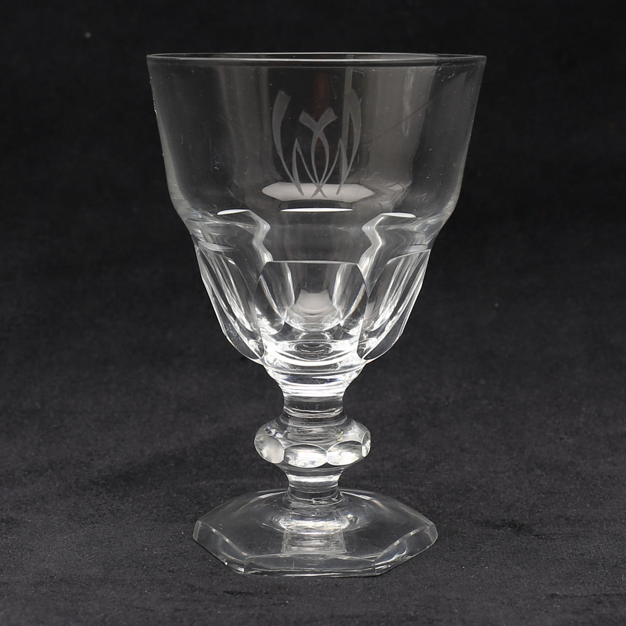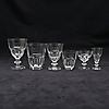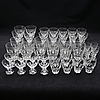 12 ölglas, höjd 11,5 cm. 10 vitvinsglas, 11 cm. 8 selterglas, 8 cm. 8 likörglas, 8 cm. 4 rödvinsglas, 13 cm. 4 snapsglas, 9,5 cm.