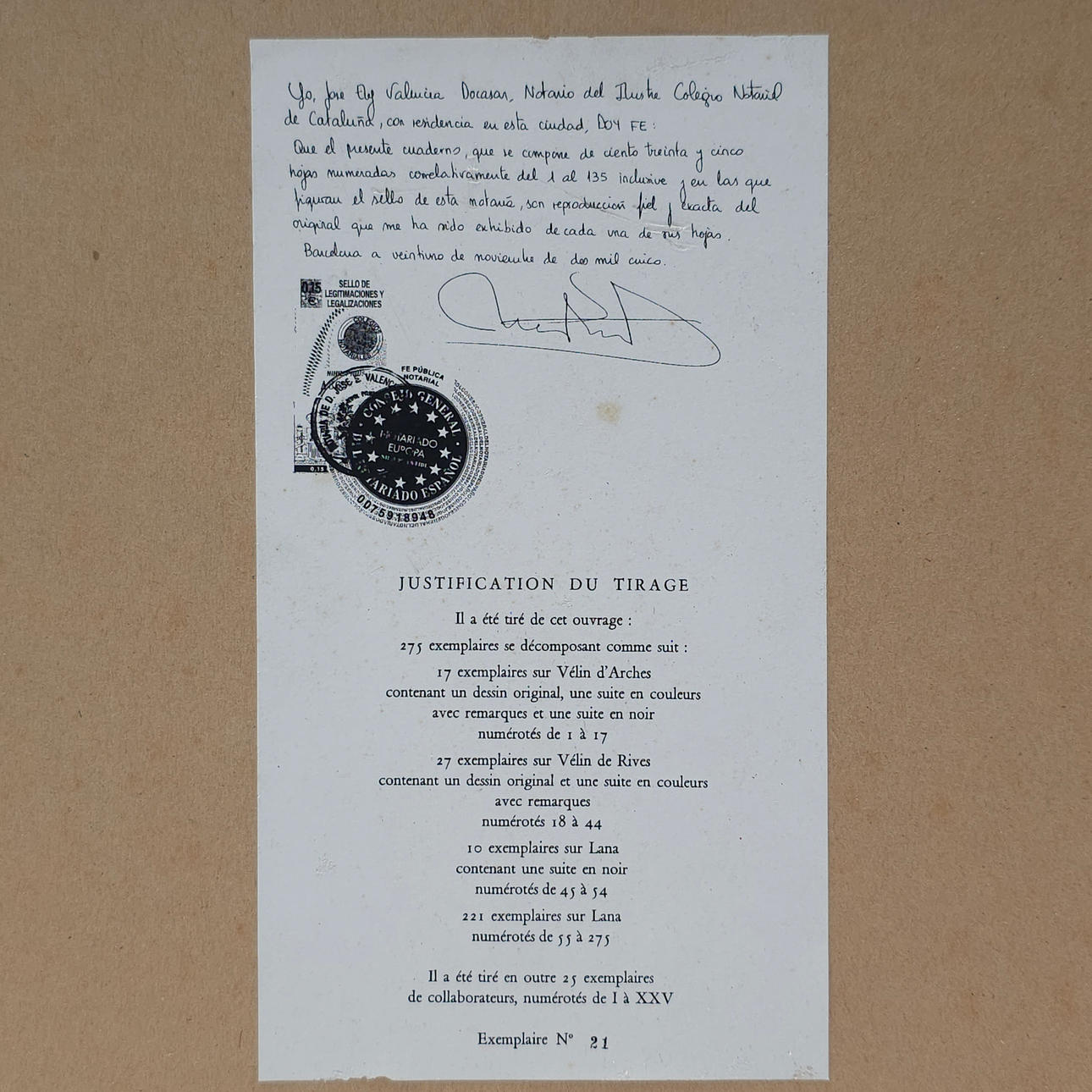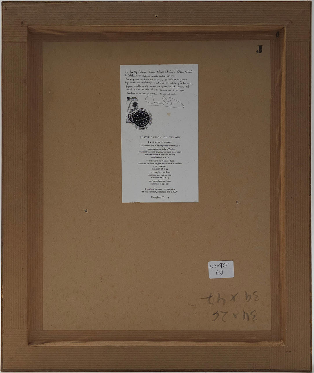 På baksidan finns motiveringen för upplagan, nummer 21, en kopia av originalet till litografiboken. Osignerad eller numrerad.