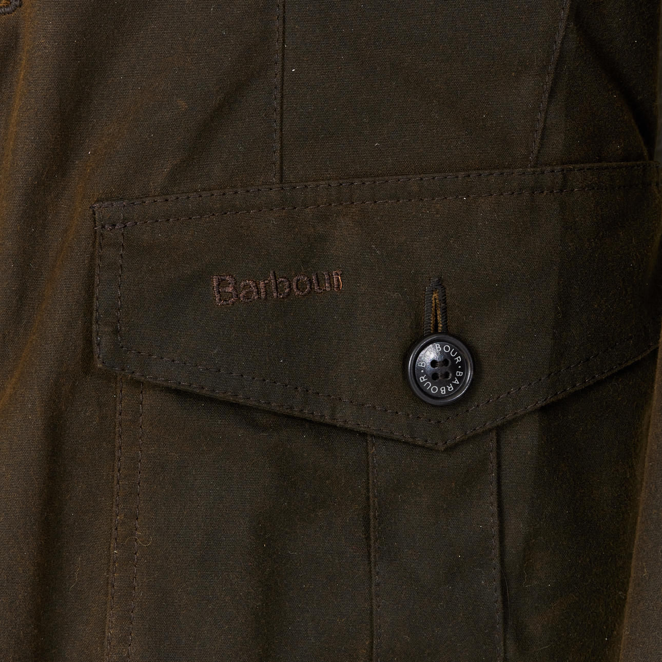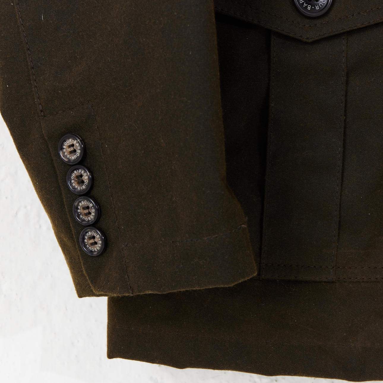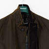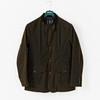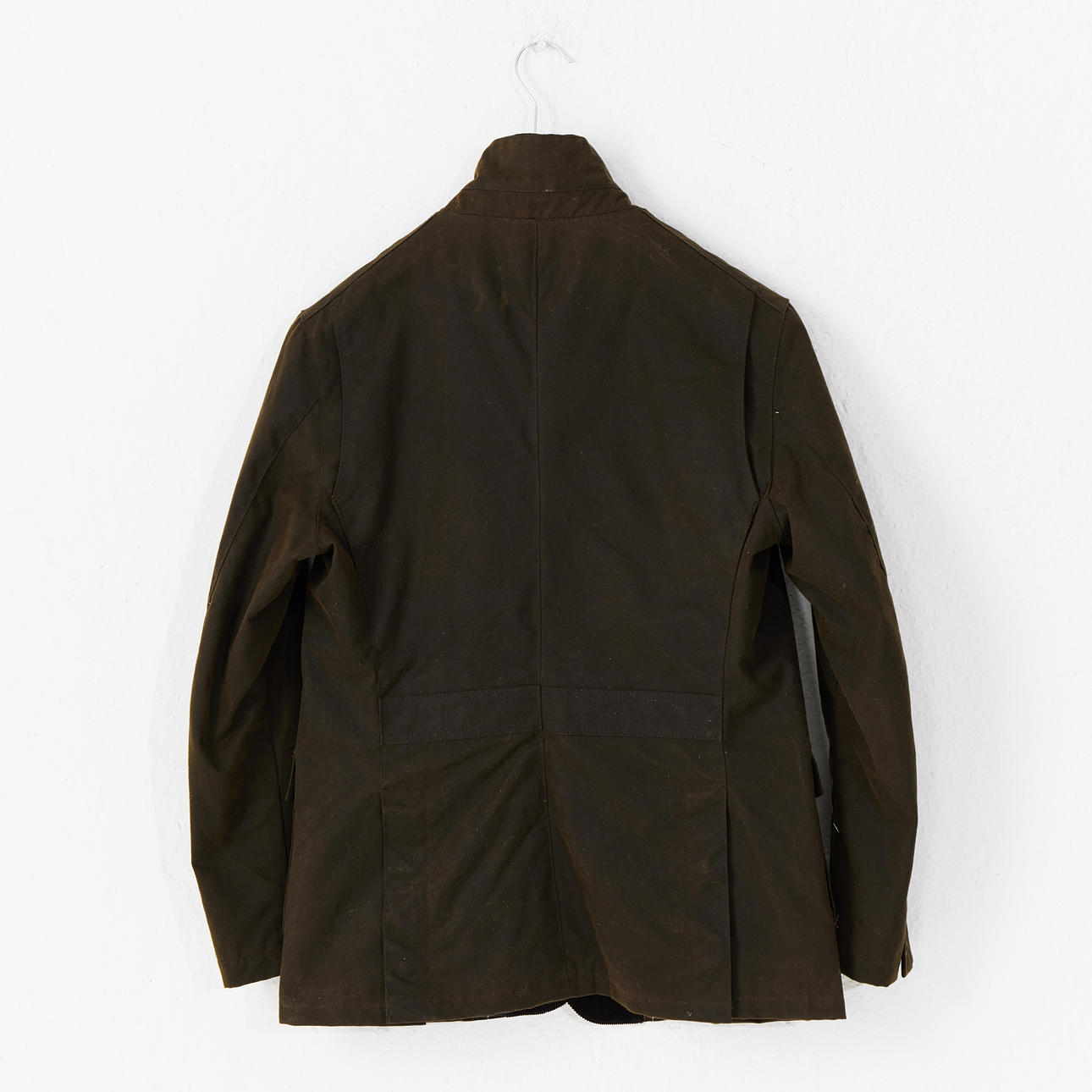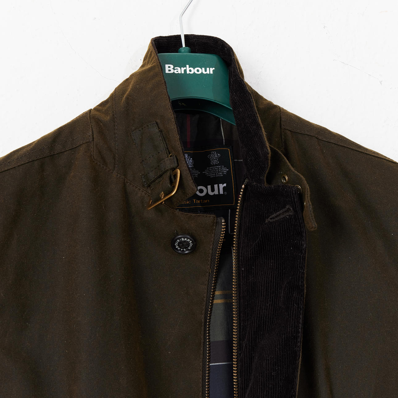Olivgrön, brun manchesterkrage, stänges med dragkedja och knappar, 2 fickor utanpå, storlek medium, längd 79cm.