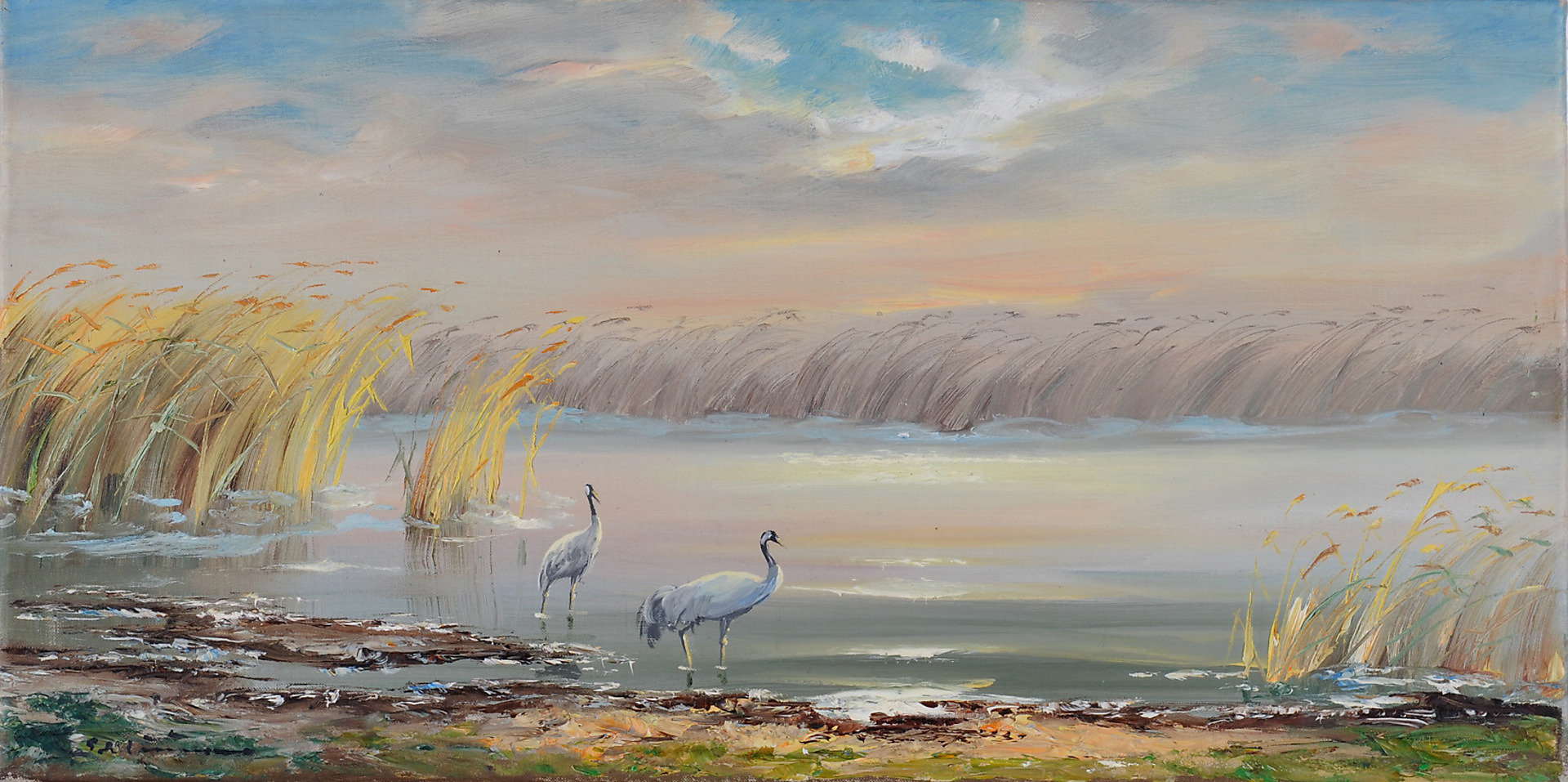 331186. SIGNIERT. Gråhäger i vassen.