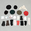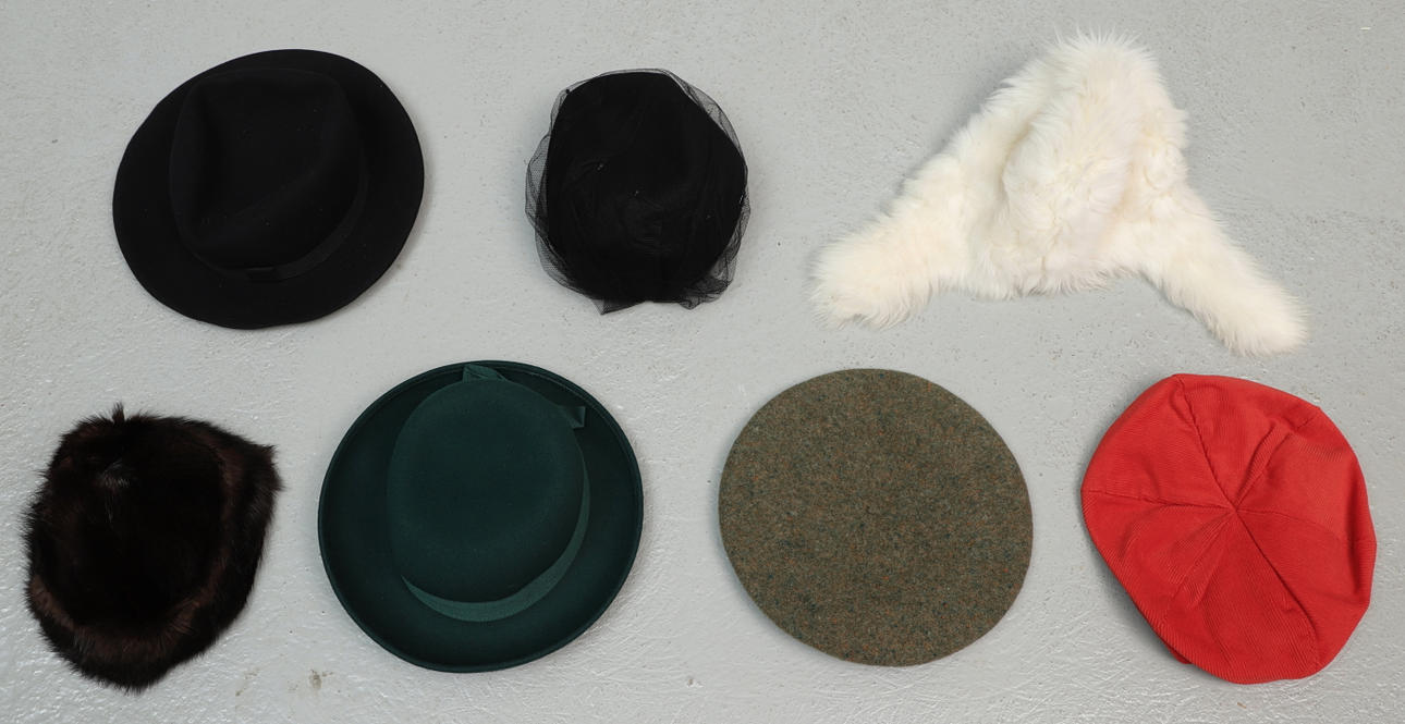 Mössor/hattar, 7 st, bl.a. Gudrun Sjödén. Damhandskar, 11 par, varierande längder. Näsdukar, 22 st, varierande storlekar.