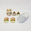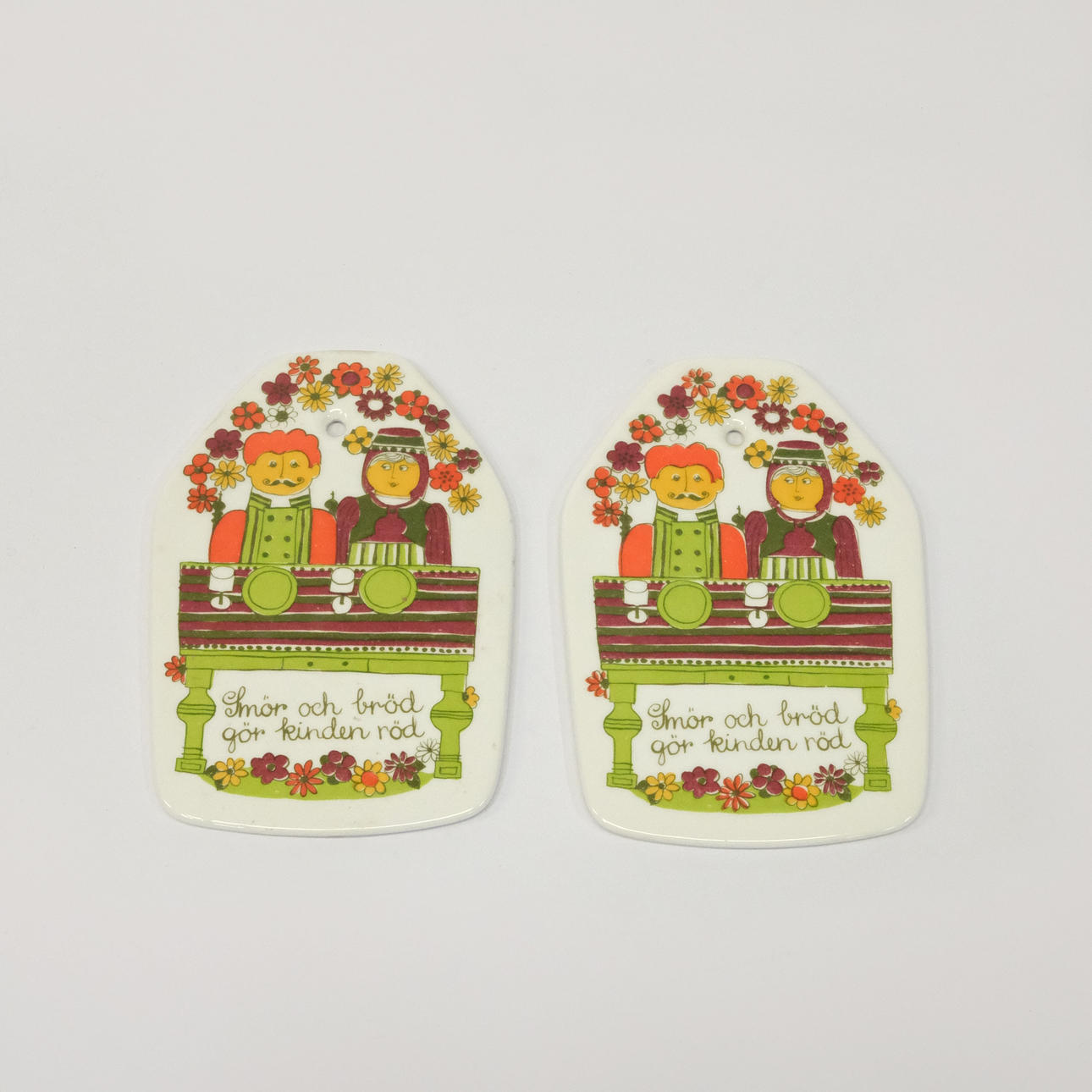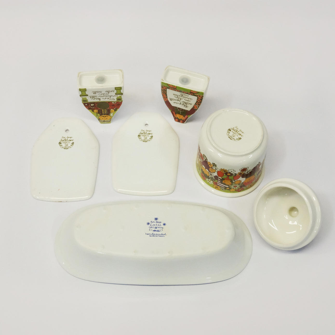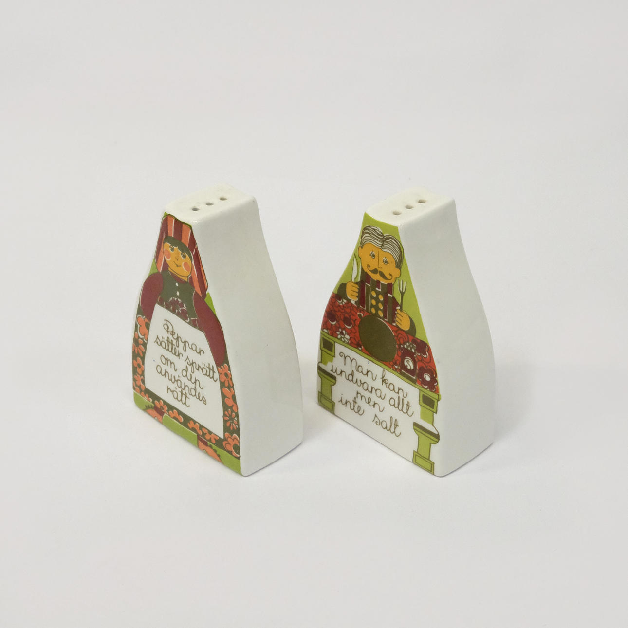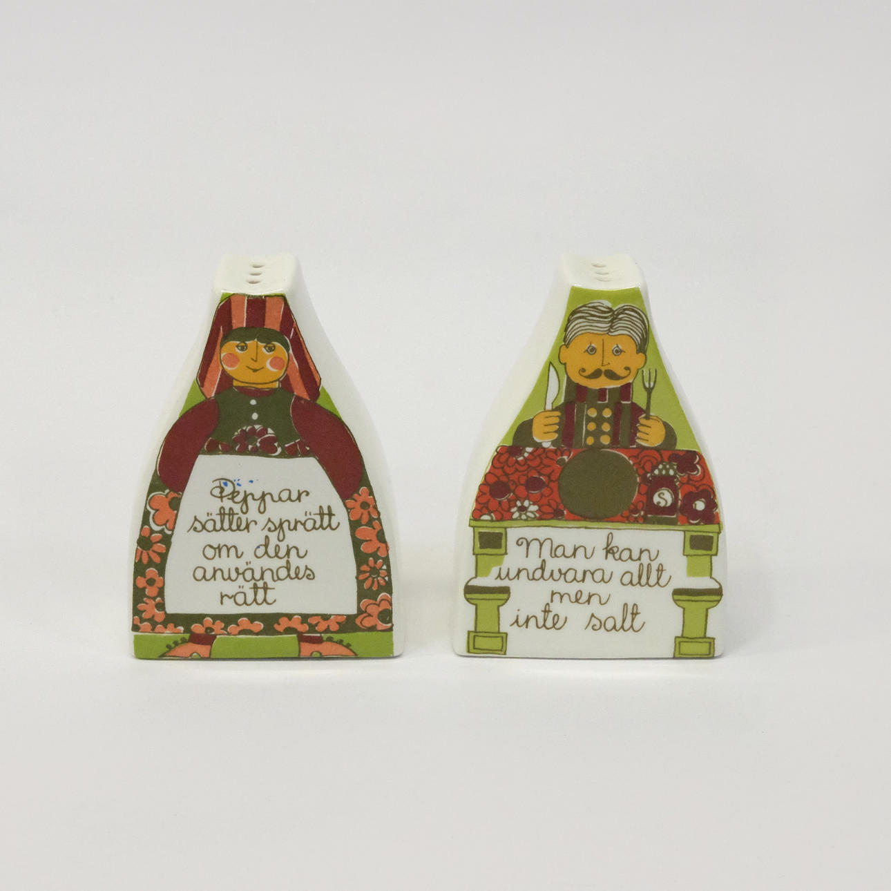 Fem delar Turi Design, Folklore: två skärbrädor, längd 15,5x11cm. Två ströare, höjd 10cm. Burk med lock, höjd 16cm, diam. 11cm.