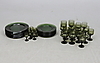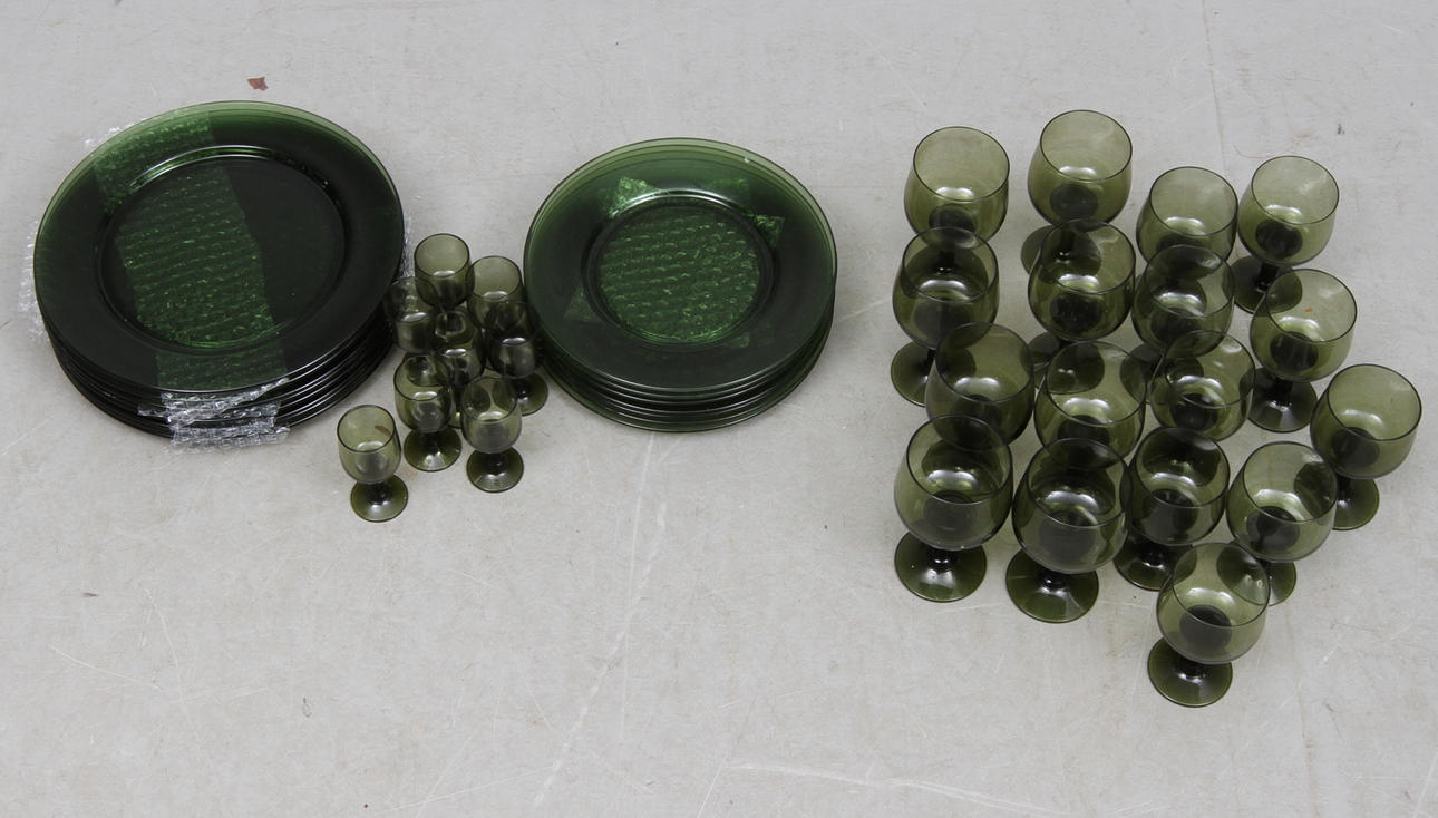 Gröntonad glasmassa. 8 sherryglas, 9 vitvinglas, 8 rödvinsglas