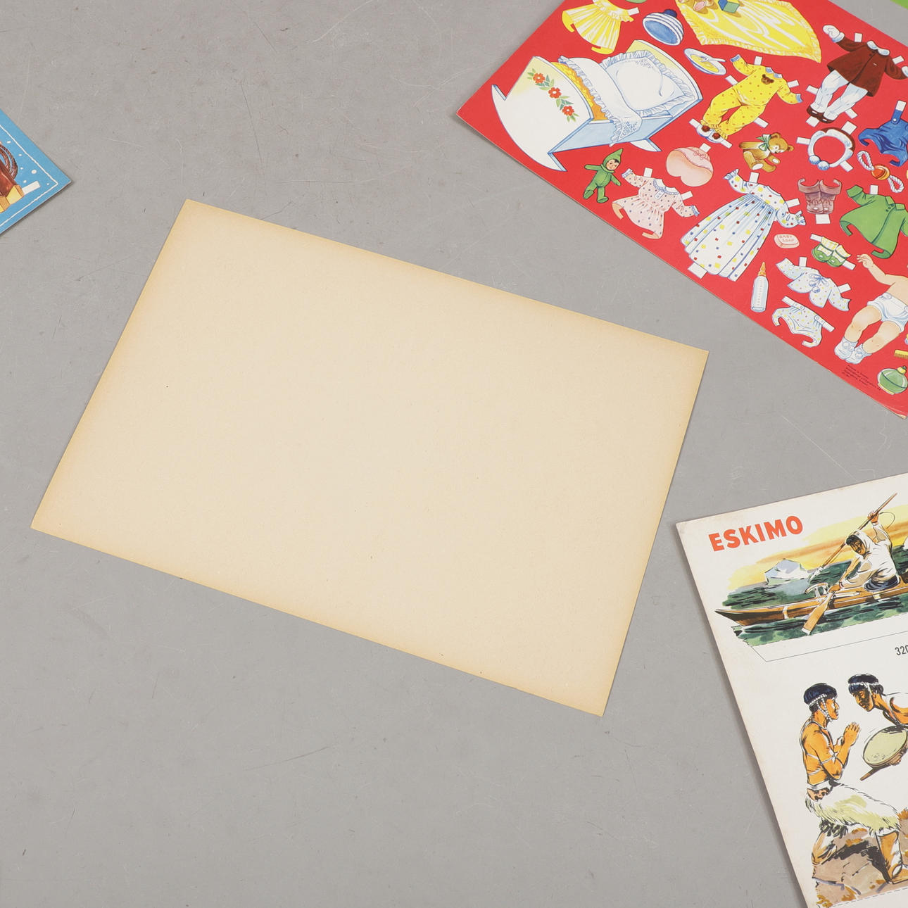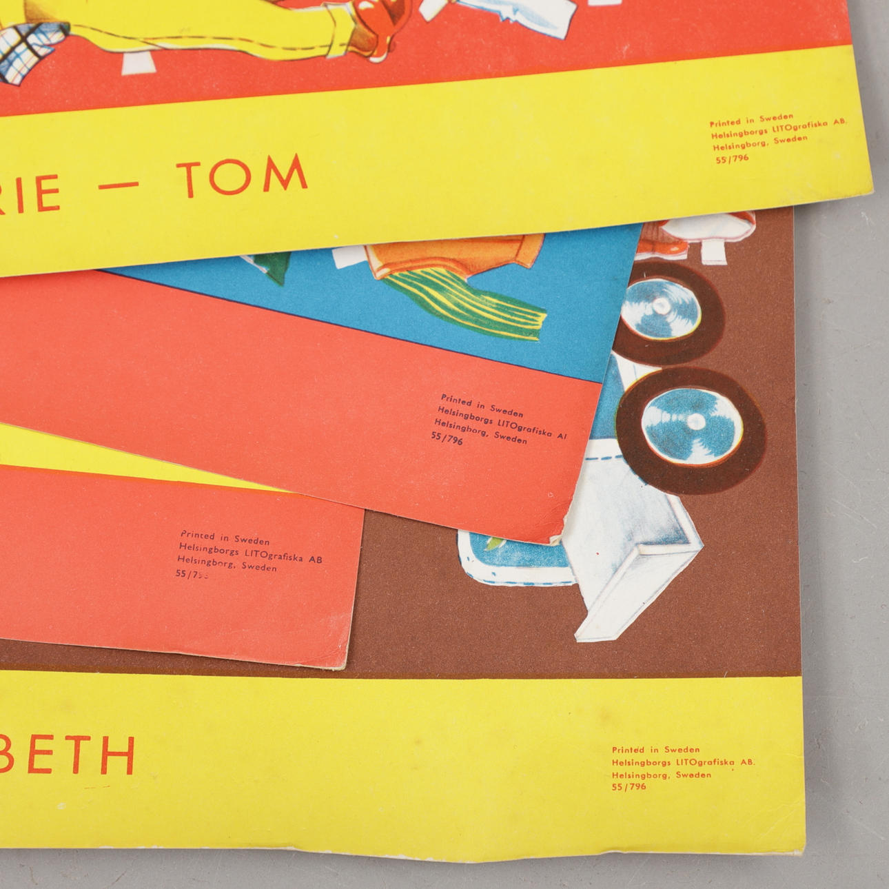 13 st, varav flera dubbletter, pappark med klippdockor, utgivna av Helsingborgs Lithografiska på 1950-talet, mått ca 50x34,5 cm.