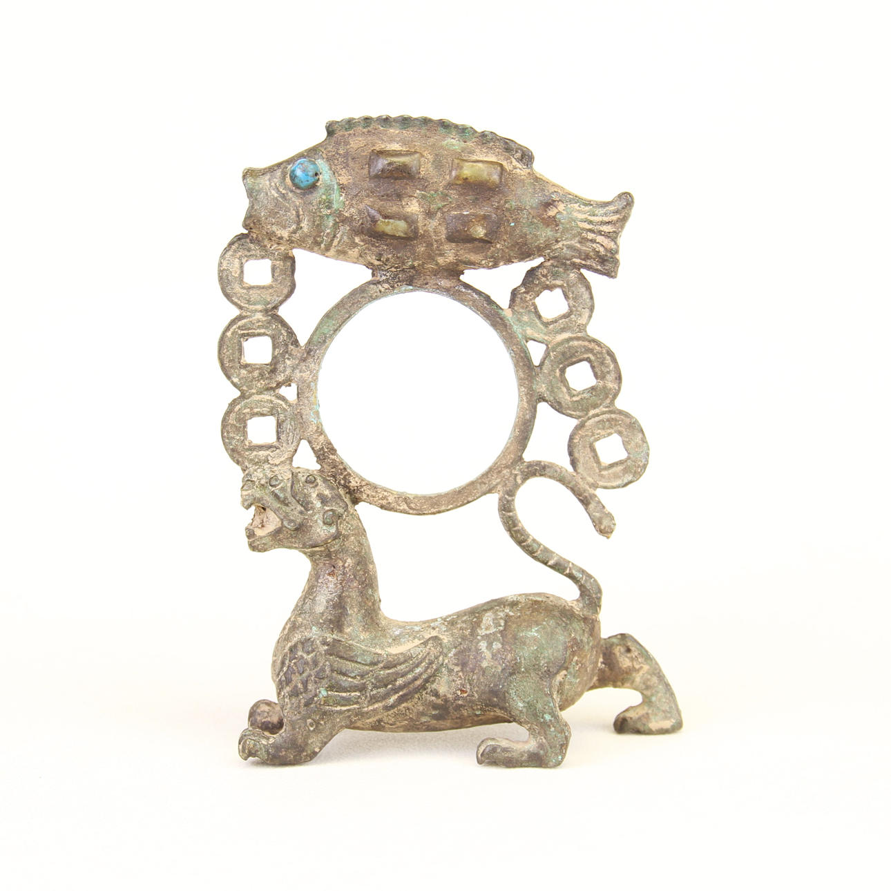 En ovanlig kinesisk arkaisk formfigur av brons med en mytisk bevingad varelse, en fisk infälld med jade och symboliska mynt, H. 17cm.