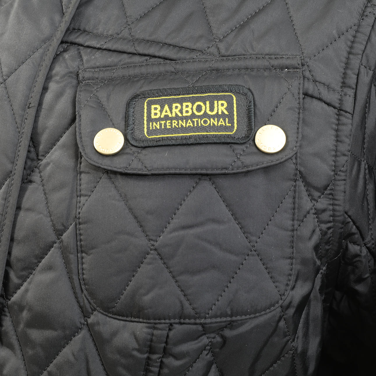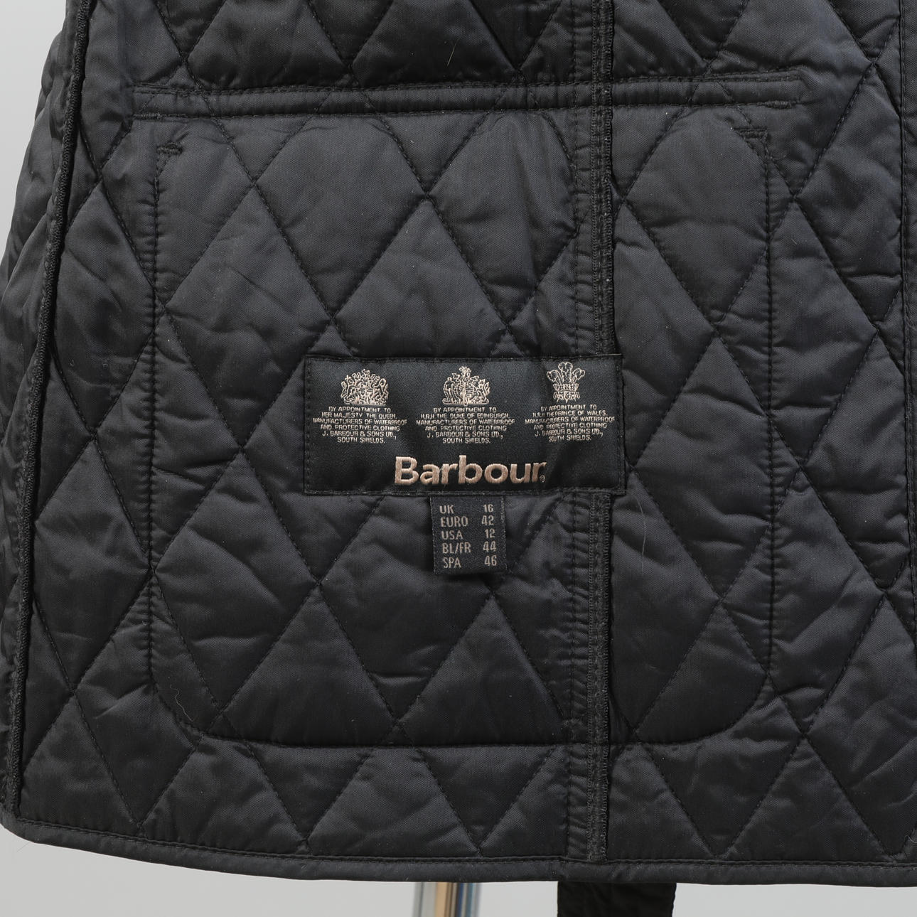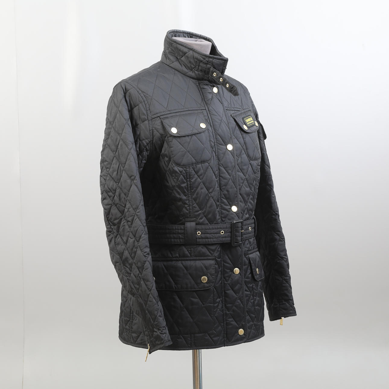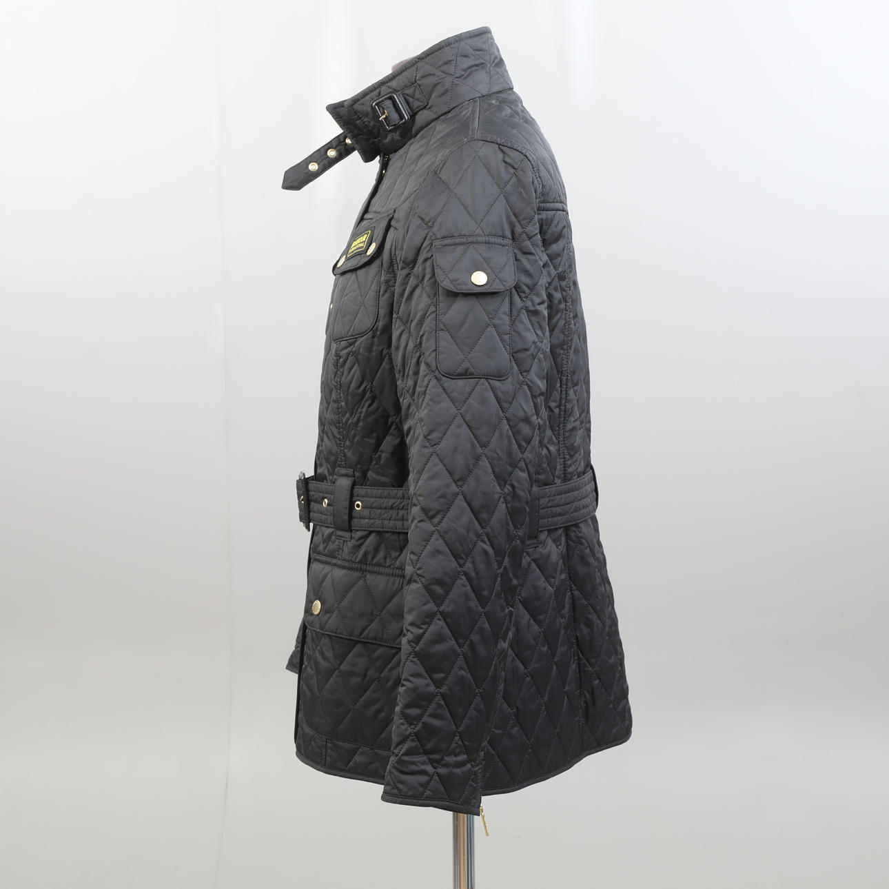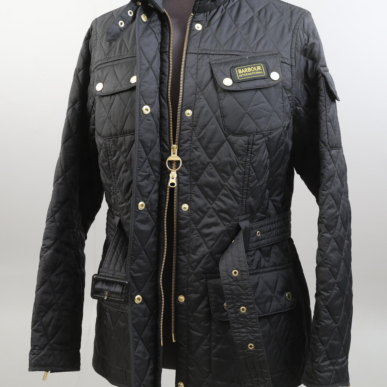 Dam jacka från Barbour International, Jackan är matelasserad/ qulitad. Storlek: Eu 42/ Uk 16/ Usa 12, normal passform. Färg: svart med guldfärgade detaljer. Ståkrage, skärp i midjan, jackan stängs med dragkedja och trycknappar, 4 stycken knappförsedda fickor.