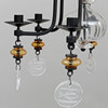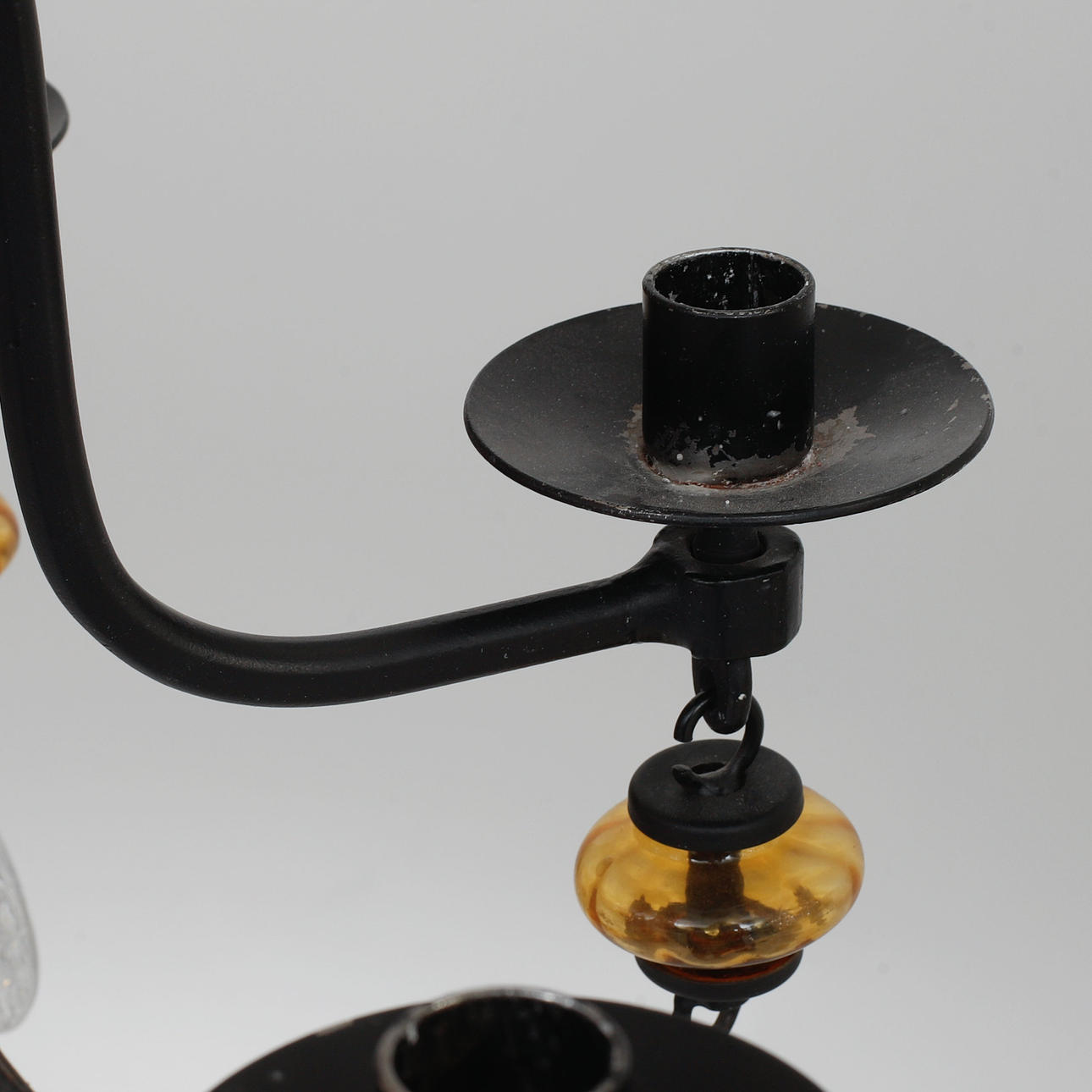 Stomme i smide med glasdekor. För sex ljus. Tio förlängningsstavar à 16,5 cm samt en extra glasuppsättning i blått finns. Diameter ca 50 cm, höjd ca 65 cm.